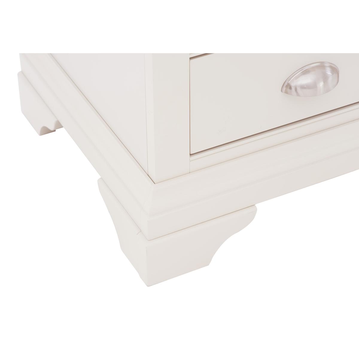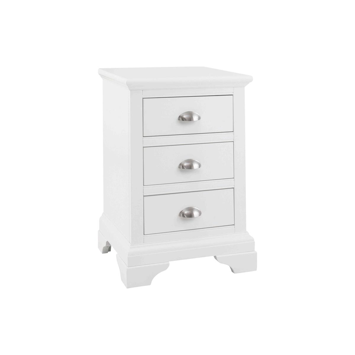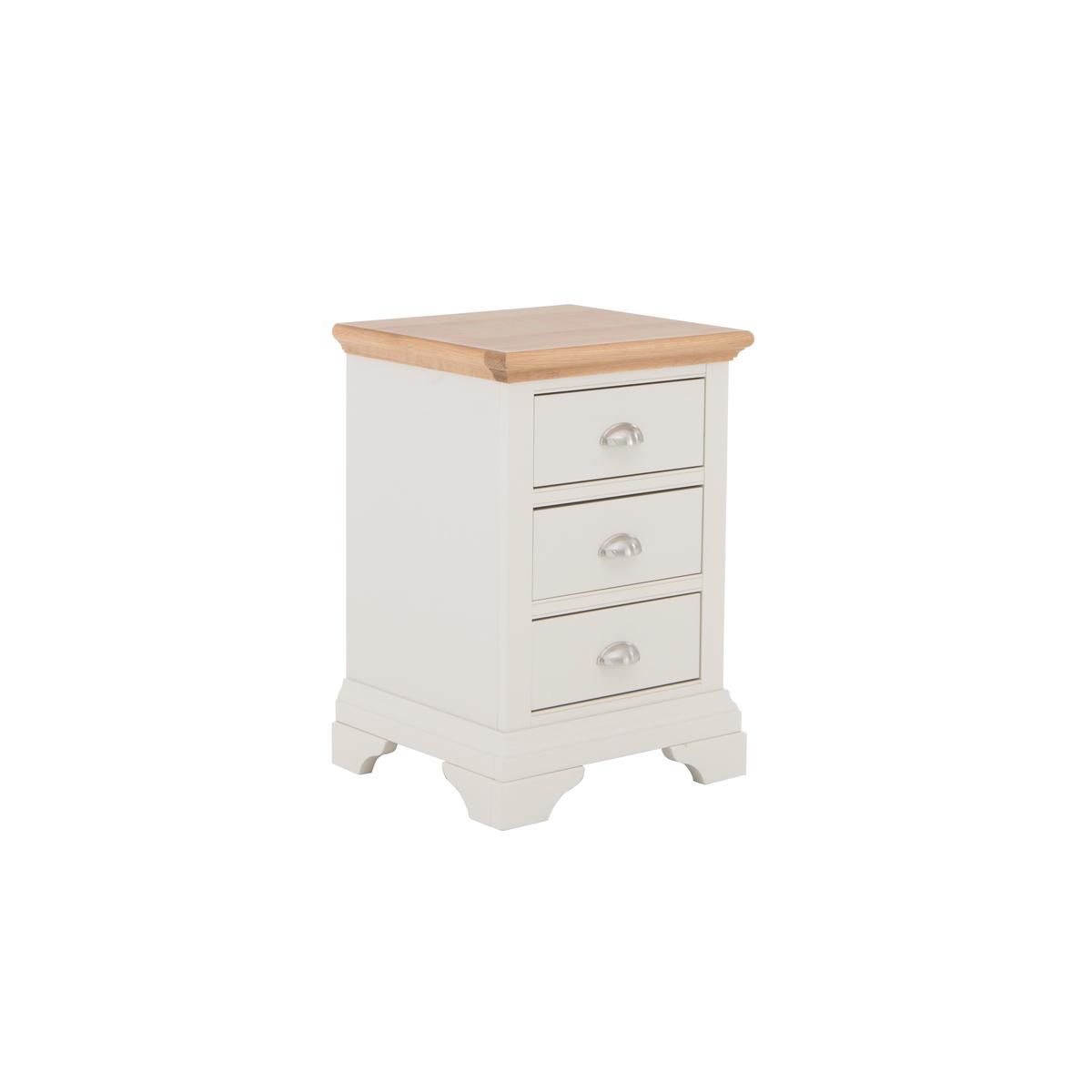 A beautiful blend of traditional and contemporary, the Emily collection of bedroom furniture is timelessly charming. A choice of painted wood, all wood and two tone finishes includes painted grey with oiled American oak solids and veneers. This elegant bedroom furniture has brushed steel cup handles, corniced tops and bracket feet or tapered legs. Practical touches include a lacquer finish and Blum soft-closing drawers. Small but perfectly formed, the Emily 3 drawer bedside chest with cornice top has lovely details and plenty of storage – exactly what you’re looking for in a nightstand. It also perfectly complements the simple and stylish Emily bed frame or even the Emily headboard. A practical choice, this roomy bedside cabinet has three soft-closing drawers, each finished with a brushed-steel cup handle. Crafted with a durable solid wood frame, it rests on sturdy bracket feet and has a wipe-clean lacquer finish, making it a hardwearing piece designed to look beautiful for years to come. With chests of drawers, wardrobes, bed frame, blanket box, the Emily 3 drawer bedside chest and more, the Emily bedroom furniture collection is all you need to create a lovely bedroom. Available in a range of oak, walnut and painted finishes. WARNING!. Furniture can tip over unexpectedly and cause injury. This item shall be fixed to a wall using the anti-tip kit provided with the furniture. Be sure to use the correct wall fixings suitable for the walls in your home.