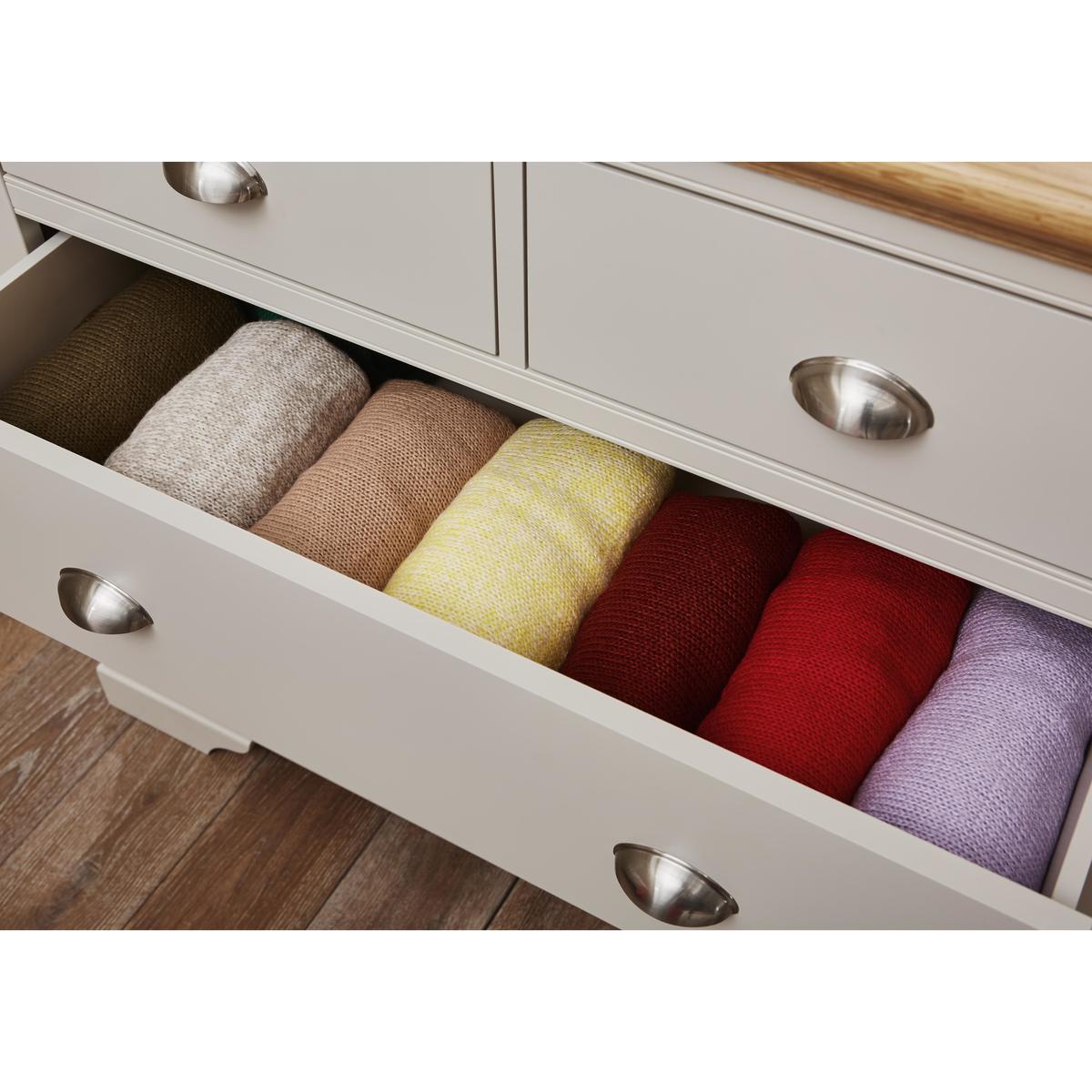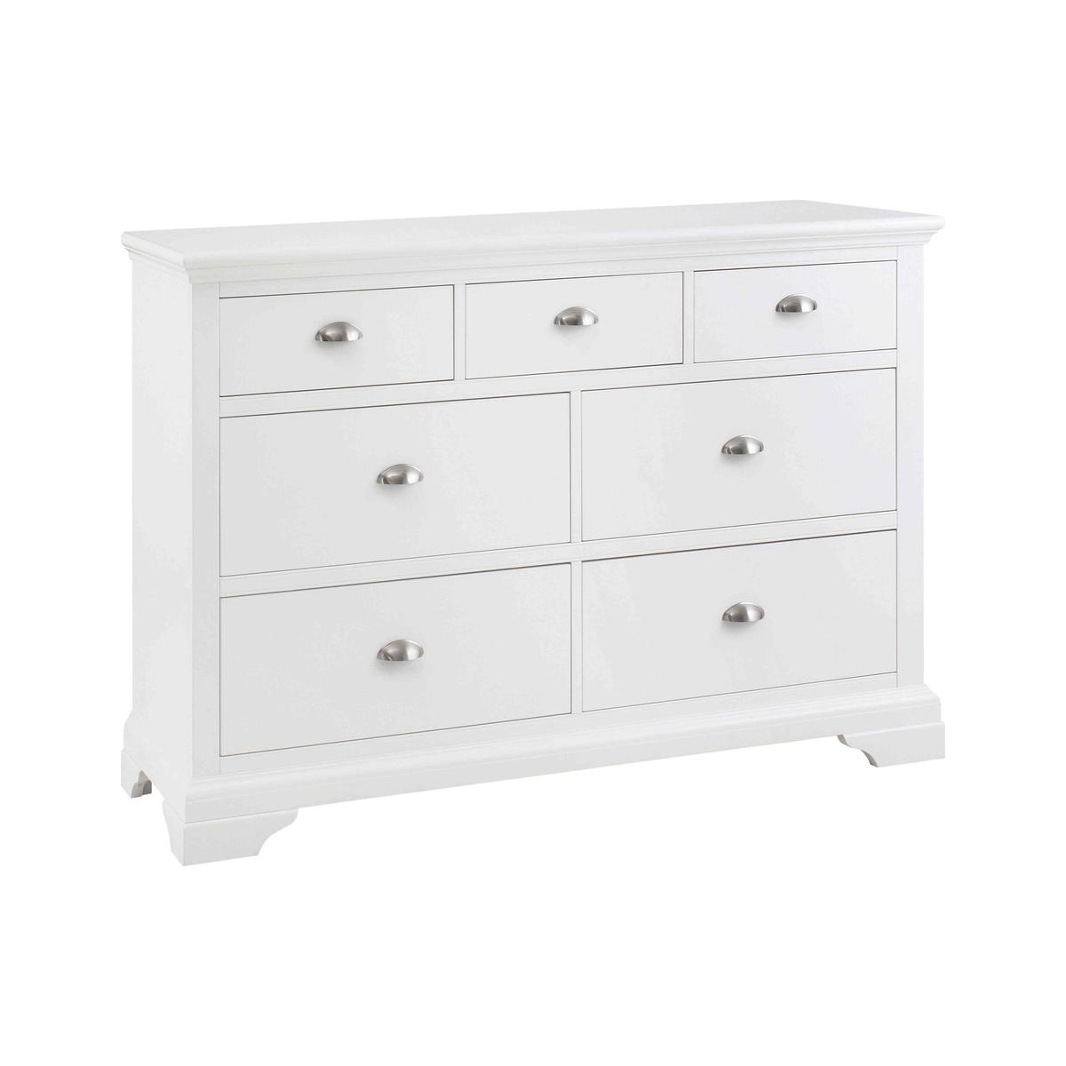 Combining timeless style with exceptional storage, the Emily 7 drawer chest is a beautiful piece for any bedroom. With seven drawers four larger ones, ideal for bulky clothes, and three smaller ones that are perfect for accessories this could be the only piece of storage furniture that your bedroom needs. And its built to last, too. The frame is solid wood and the drawers have soft- closing runners. Resting on sturdy bracket- style feet, its sealed with a durable lacquer coating so its easy to keep clean. With a traditional- style cornice top and more modern brushed- steel cup handles, this seven drawer chest stylishly blends rustic charm with contemporary appeal. This lovely chest of 7 drawers is part of the Emily bedroom furniture collection. The range also includes wardrobes, headboard, dressing table, 4 drawer chest and more available in five different oak, walnut and fashionable painted finishes. WARNING! Furniture can tip over unexpectedly and cause injury. This item must be fixed to a wall using the anti- tip kit provided. Be sure to use the correct wall fixings suitable for the walls in your home. Furniture Village is not able to fix anti- tip devices for you. Seek professional advice if you are unsure.