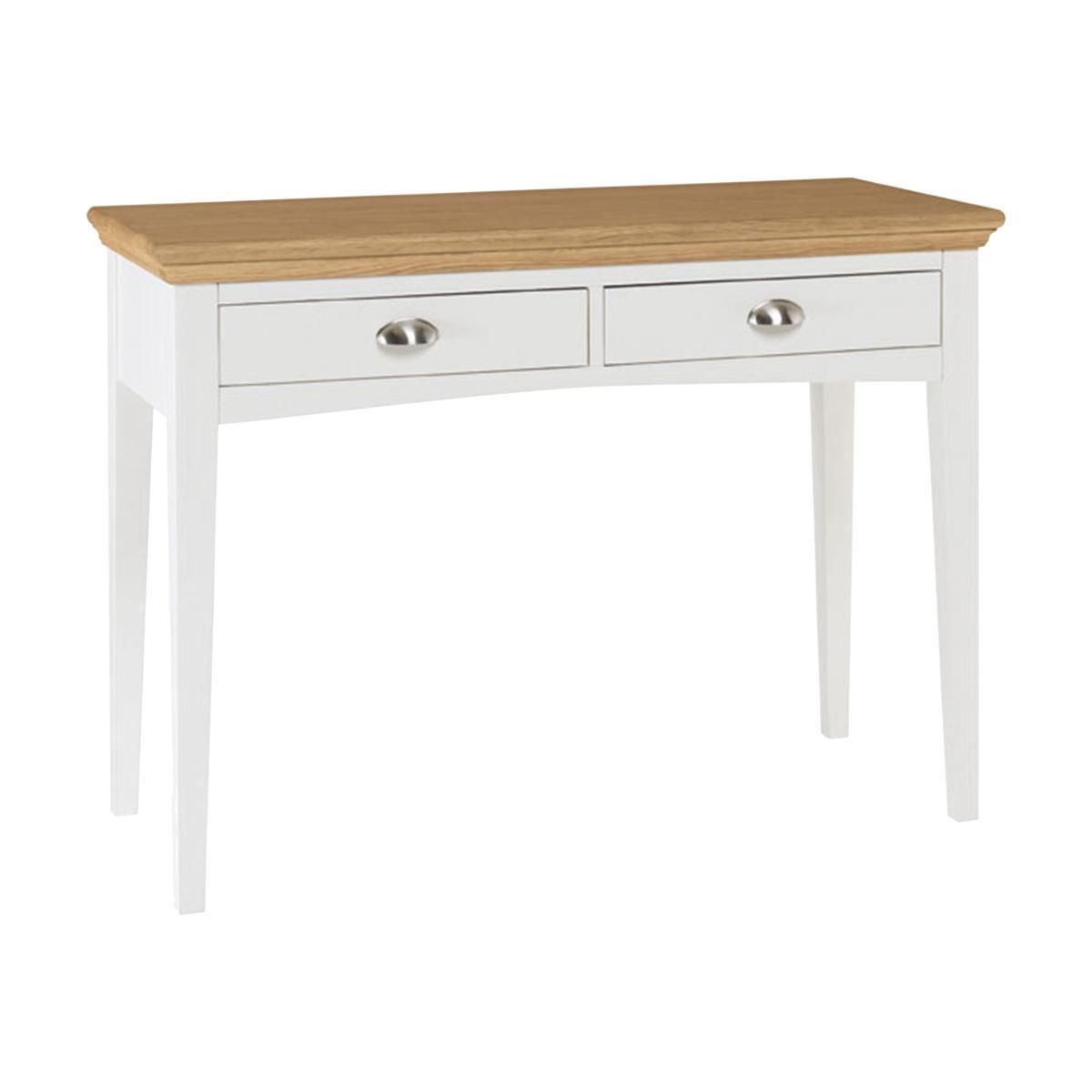 A beautiful blend of traditional and contemporary, the Emily collection of bedroom furniture is timelessly charming. A choice of painted wood, all wood and two tone finishes includes painted grey with oiled American oak solids and veneers. This elegant bedroom furniture has brushed steel cup handles, corniced tops and bracket feet or tapered legs. Practical touches include a lacquer finish and Blum soft-closing drawers. The timelessly rustic Emily dressing table is the perfect combination of elegant style and practical design. Beautifully crafted and with a solid wood frame, this lovely dressing table has a traditional cornice top and elegant tapered legs. Featuring two shallow drawers with brushed steel cup handles and soft-closing runners, and finished with a wipe-clean lacquered surface, this vanity table is the perfect way to store and display cosmetics, perfume and jewellery. Pair it with the Emily vanity mirror and matching Emily stool, both available separately, and create a stylish and functional place to get ready every morning. Part of the charming Emily bedroom furniture collection that includes wardrobes, bedframe, chests of drawers and bedside cabinet, the Emily dressing table is available in a choice of oak, walnut and painted finishes. WARNING!. Furniture can tip over unexpectedly and cause injury. This item shall be fixed to a wall using the anti-tip kit provided with the furniture. Be sure to use the correct wall fixings suitable for the walls in your home.