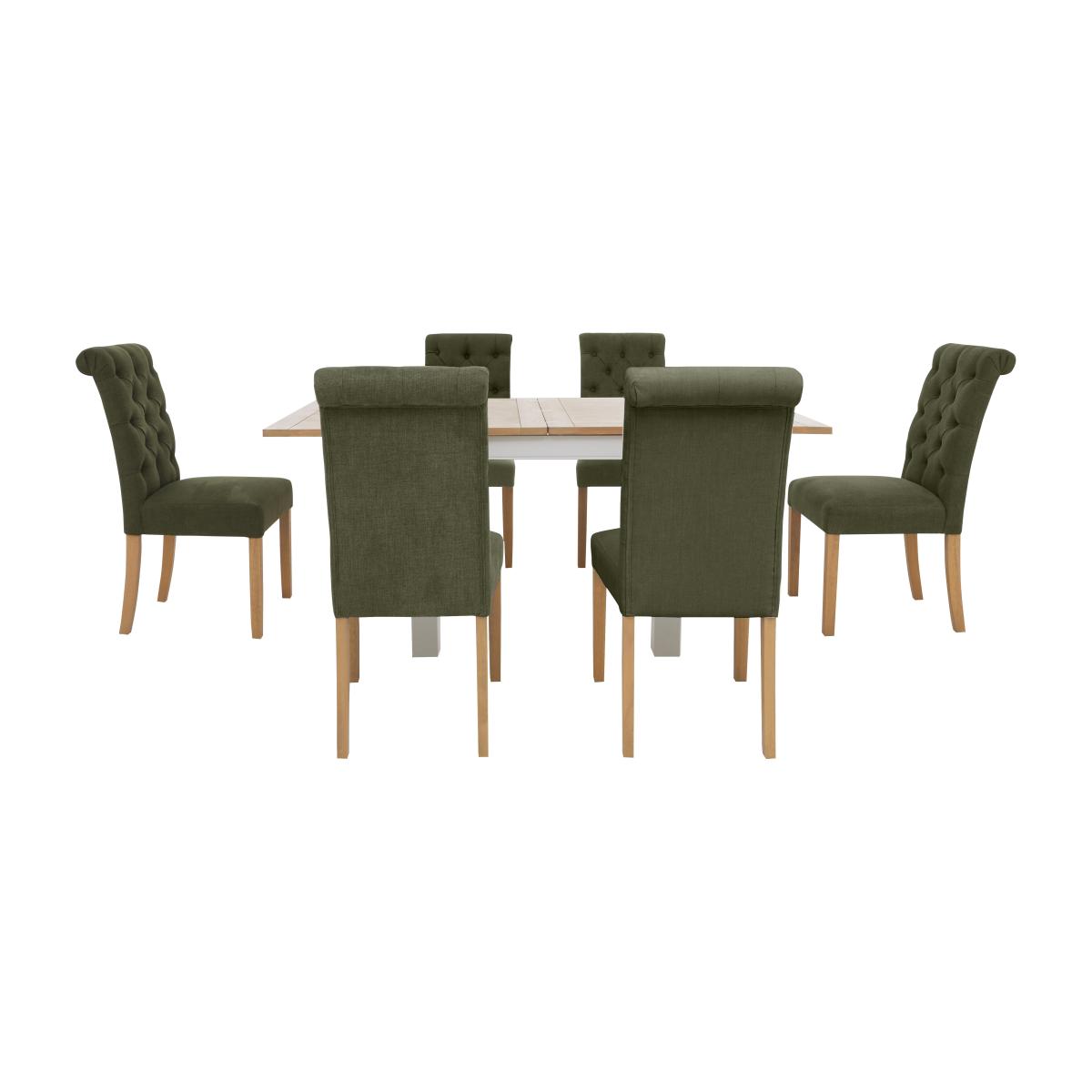 Designed for stylish everyday living, our modern country Hamilton range offers a huge choice of furniture options at really incredible-value prices. With its signature grey-washed American oak and white-painted finish, this extensive collection of mix and match extending dining tables and dining chairs, dining sets, storage furniture and occasional tables will always look at home. Pieces are beautifully crafted and offer many clever living and dining furniture solutions for compact spaces and larger rooms alike, alongside an easy-to-live-with look that will never go out of style. The Hamilton collection is exclusive to Furniture Village. Very stylish and also very much suited to compact dining spaces, this flip top dining table transforms from square to rectangular in shape. This dining set includes six buttoned chairs. Why you'll love it Stylish and practical extending dining set with luxe dining chairs. Modern country style at a great-value price. Flip top dining table extends to seat 8 with a sliding extension mechanism. Solid American oak and American oak veneer top in a contemporary grey wash. Stylish coordinating white-painted legs. Dining set includes 6 button back dining chairs. Chairs have row upon row of stylish buttoning. Elegant rolled tops. In a choice of upholstery fabrics. Exclusive to Furniture Village. This flip top extending dining set is part of our Hamilton range. What you need to know Seats 6 closed and 8 when extended. American oak and American oak veneer surfaces may display knots, markings and colour variation. Avoid placing in direct sunlight or close to heat. We recommend using coasters and placemats at all times.