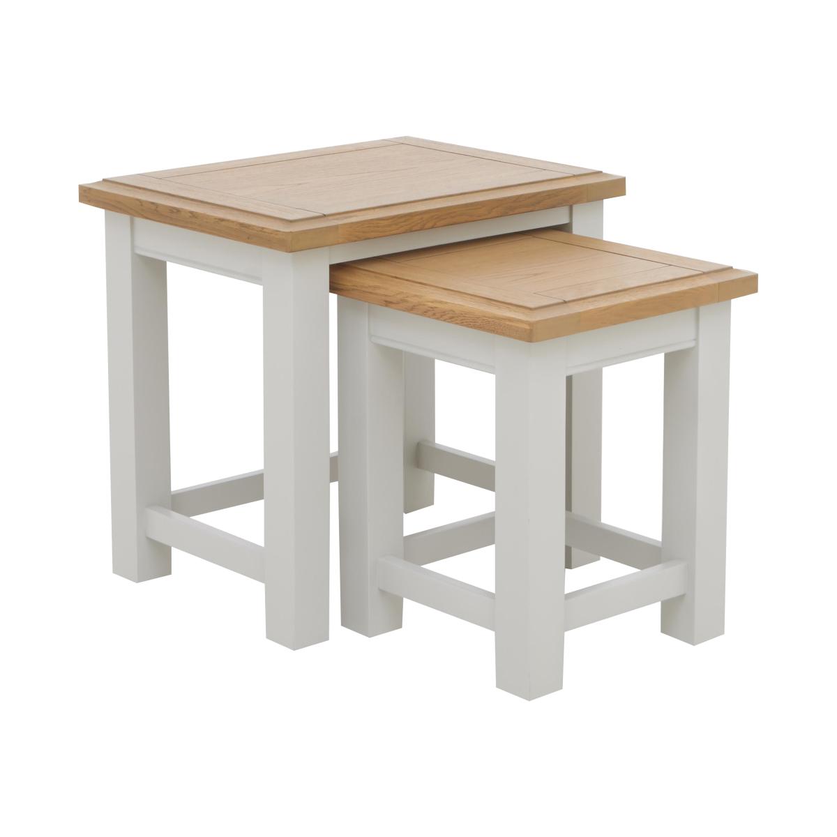Designed for stylish everyday living, our modern country Hamilton range offers a huge choice of furniture options at really incredible-value prices. With its signature grey-washed American oak and white-painted finish, this extensive collection of mix and match extending dining tables and dining chairs, dining sets, storage furniture and occasional tables will always look at home. Pieces are beautifully crafted and offer many clever living and dining furniture solutions for compact spaces and larger rooms alike, alongside an easy-to-live-with look that will never go out of style. The Hamilton collection is exclusive to Furniture Village. You’ll never be short of an end table or two with this next of tables, part of our Hamilton range. Space-saving and stylish, these well-priced tables have American oak tops and painted legs. Why you'll love it This lovely nest of tables is ready whenever guests pop over. Modern country style at a great-value price. Solid American oak and American oak veneer top in a contemporary grey wash. White-painted legs. Exclusive to Furniture Village. This nest of tables is part of our Hamilton range. What you need to know American oak and American oak veneer surfaces may display knots, markings and colour variation. Avoid placing in direct sunlight or close to heat. We recommend using coasters and placemats at all times.