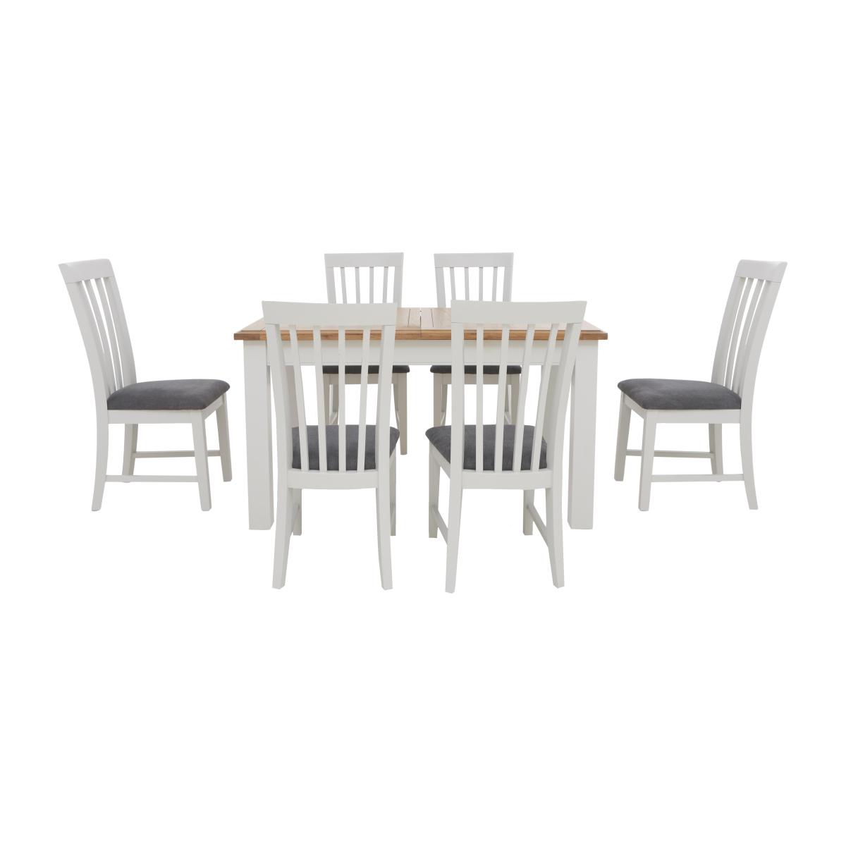 Designed for stylish everyday living, our modern country Hamilton range offers a huge choice of furniture options at really incredible-value prices. With its signature grey-washed American oak and white-painted finish, this extensive collection of mix and match extending dining tables and dining chairs, dining sets, storage furniture and occasional tables will always look at home. Pieces are beautifully crafted and offer many clever living and dining furniture solutions for compact spaces and larger rooms alike, alongside an easy-to-live-with look that will never go out of style. The Hamilton collection is exclusive to Furniture Village. Seating up to eight in style, this extending dining table in this set has a lovely grey-washed American oak top. We’ve paired it with six slatted dining chairs. An instant classic. Why you'll love it This beautiful wood dining set will be a family favourite for years to come. Modern country style at a great-value price. Dining table extends to seat 8 with a simple clockwork mechanism. Solid American oak and American oak veneer table top in a contemporary grey wash. Stylish coordinating white-painted legs. Dining set includes 6 wooden dining chairs. Supportive slatted backs. White-painted finish with comfy fabric-upholstered seats. Exclusive to Furniture Village. This rectangular extending dining set is part of our Hamilton range. What you need to know Chairs have foam cushioning and wood legs. Table seats 6 closed and 8 when extended. American oak and American oak veneer surfaces may display knots, markings and colour variation. Avoid placing in direct sunlight or close to heat. We recommend using coasters and placemats at all times.