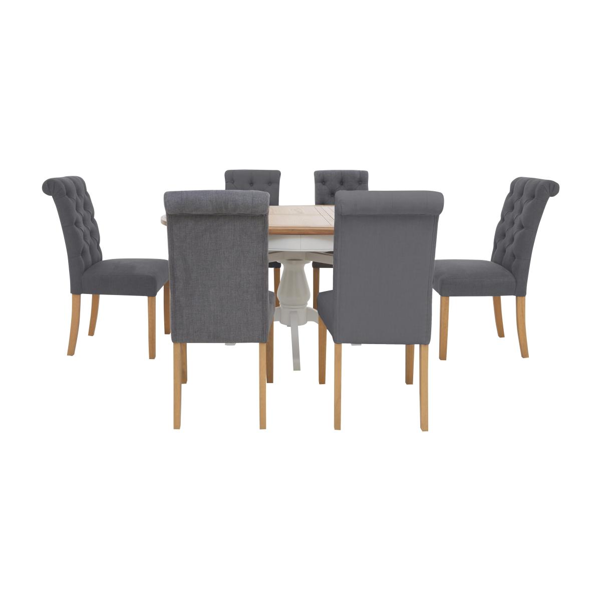 Designed for stylish everyday living, our modern country Hamilton range offers a huge choice of furniture options at really incredible-value prices. With its signature grey-washed American oak and white-painted finish, this extensive collection of mix and match extending dining tables and dining chairs, dining sets, storage furniture and occasional tables will always look at home. Pieces are beautifully crafted and offer many clever living and dining furniture solutions for compact spaces and larger rooms alike, alongside an easy-to-live-with look that will never go out of style. The Hamilton collection is exclusive to Furniture Village. A round dining table means nobody’s fighting for the head of the table. This one also extends to seat eight and comes with six upholstered dining chairs. Great style, great price. Why you'll love it There’s so much to love about this dining set with round extending table. Modern country style at a great-value price. Dining table extends to seat 8 with a smooth butterfly mechanism. Solid American oak and American oak veneer top in a contemporary grey wash. Stylish coordinating white-painted pedestal base. Dining set includes 6 fabric dining chairs. Gently curved shape with high, supportive backs. Fully upholstered in charcoal fabric. Exclusive to Furniture Village. This round dining set is part of our Hamilton range. What you need to know Chairs have foam cushioning and wood legs. Table seats 6 closed and 8 when extended. American oak and American oak veneer surfaces may display knots, markings and colour variation. Avoid placing in direct sunlight or close to heat. We recommend using coasters and placemats at all times.
