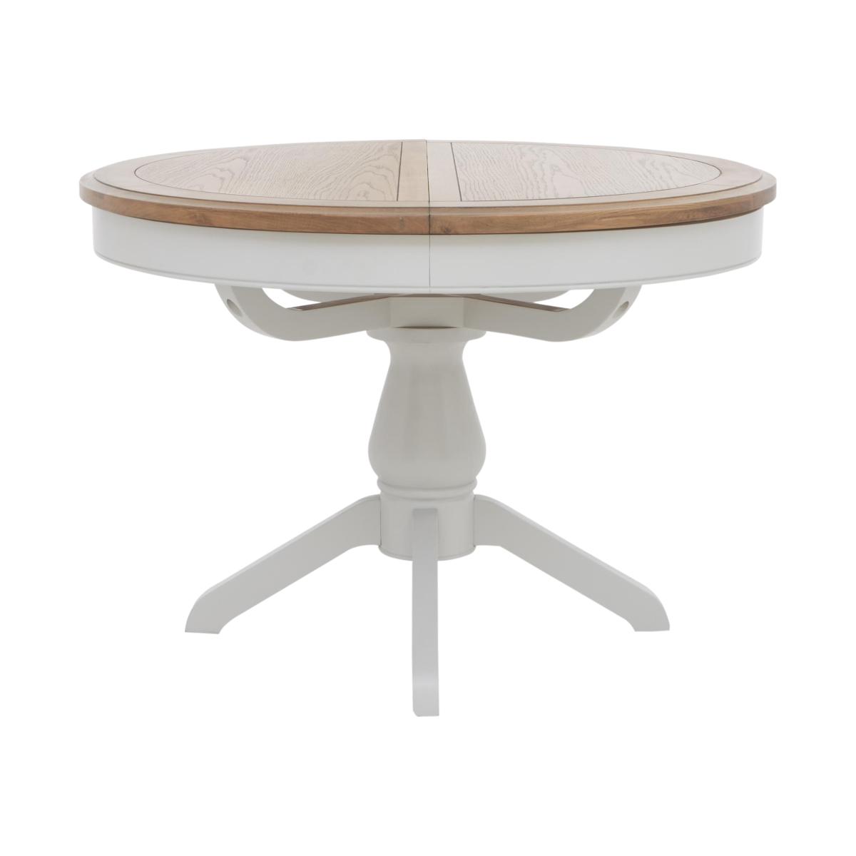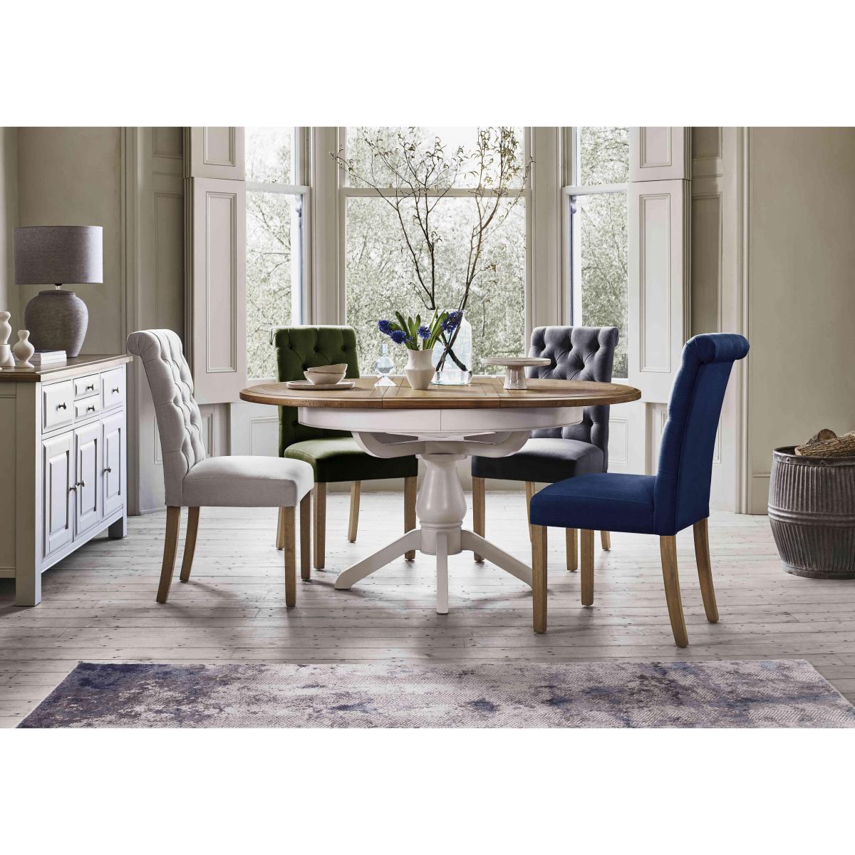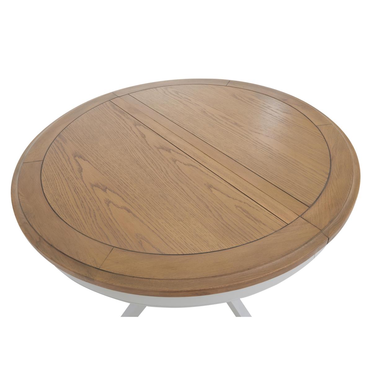 Designed for stylish everyday living, our modern country Hamilton range offers a huge choice of furniture options at really incredible-value prices. With its signature grey-washed American oak and white-painted finish, this extensive collection of mix and match extending dining tables and dining chairs, dining sets, storage furniture and occasional tables will always look at home. Pieces are beautifully crafted and offer many clever living and dining furniture solutions for compact spaces and larger rooms alike, alongside an easy-to-live-with look that will never go out of style. The Hamilton collection is exclusive to Furniture Village. This round extending American oak dining table is great for more compact spaces – and it quickly extends to seat eight whenever guests pop round. Why you'll love it This lovely round extending dining table is just made for sociable dining. Modern country style at a great-value price. Solid American oak and American oak veneer top in a contemporary grey wash. Stylish coordinating white-painted pedestal base. Extends to seat 8 with a smooth butterfly mechanism. Exclusive to Furniture Village. This round extending dining table is part of our Hamilton range. What you need to know Seats 6 closed and 8 when extended. American oak and American oak veneer surfaces may display knots, markings and colour variation. Avoid placing in direct sunlight or close to heat. We recommend using coasters and placemats at all times.