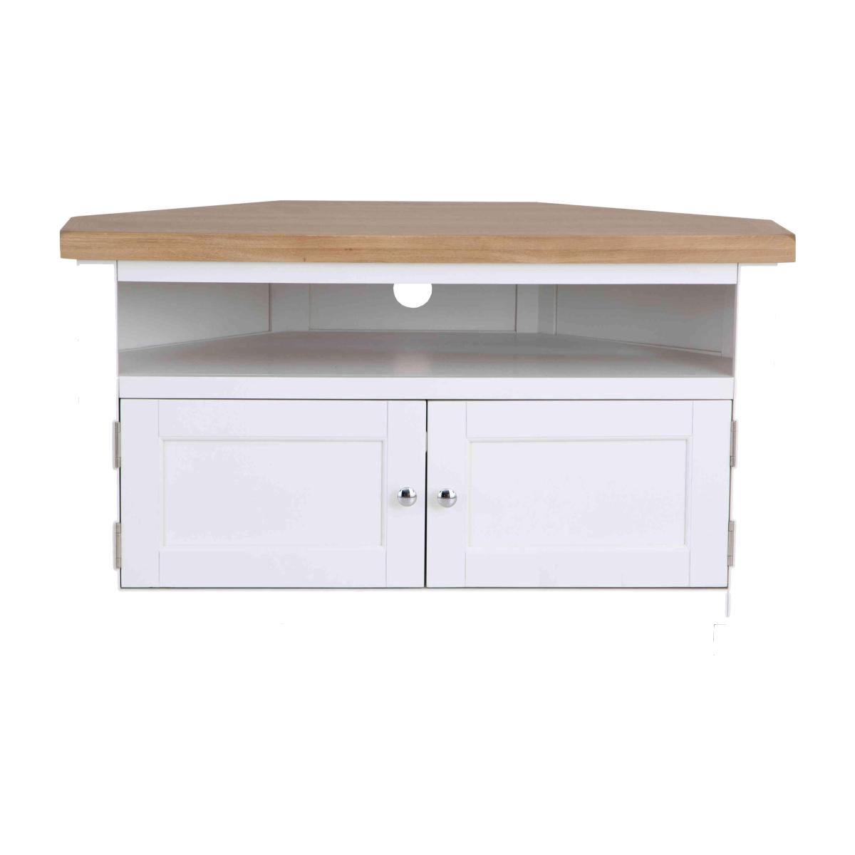 Beautifully crafted with solid oak and oak veneers, the Truro modern country furniture range showcases the beauty of real wood. But thanks to those lovely whitewashed oak tops and neatly painted frames, this is oak furniture with contemporary flair. It’s so practical, too. The collection includes occasional tables and storage pieces and also offers plenty of space-saving storage options like a hallway bench with shoe cubbies and a coffee table with drawers and storage baskets. Plus every piece in the collection is delivered fully assembled – just one more reason why it’s so easy to welcome the Truro collection to your home. The perfect storage piece for a corner in a compact living room, this TV unit is fabulously functional and very stylish with its combination of whitewashed oak and painted frame. Why you'll love it Classic oak furniture with a modern country aesthetic. Solid oak top has a fashionable whitewashed finish. Choice of colours for the painted frame. Well-crafted details – tapered legs and overhanging top. Delivered to you fully assembled. This corner TV unit is part of the Truro range. What you need to know Cupboard has 1 fixed shelf. Materials include solid oak, oak veneer and pine. Natural wood may show variations in colour, as well as filled knots and other markings. Painted finish is hardwearing but may chip if knocked. Natural oak surfaces may display knots, markings and colour variation. Avoid placing in direct sunlight or close to a heat source. Dust with a lint-free cloth. Do not use silicon-based furniture polish. Shop the Truro range for modern country storage and occasional furniture.