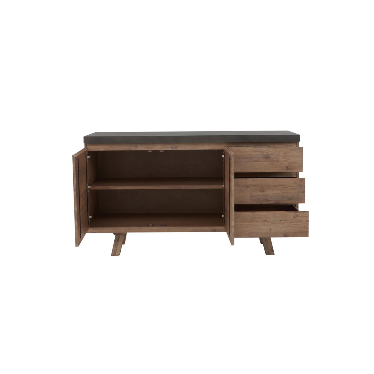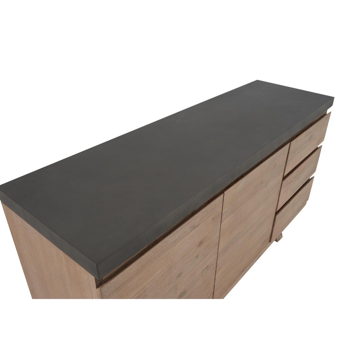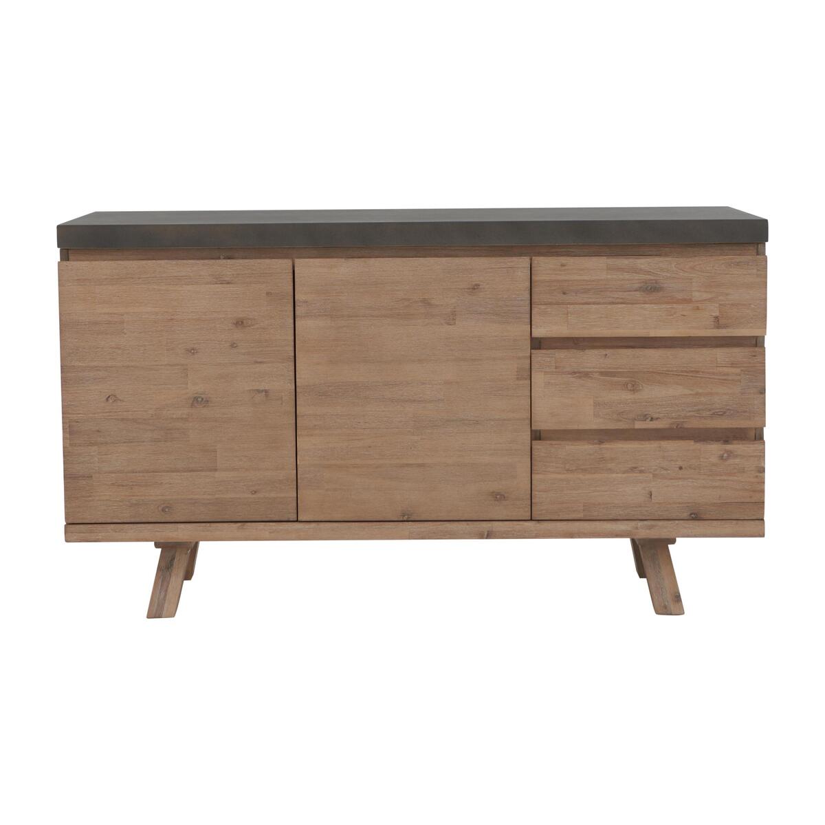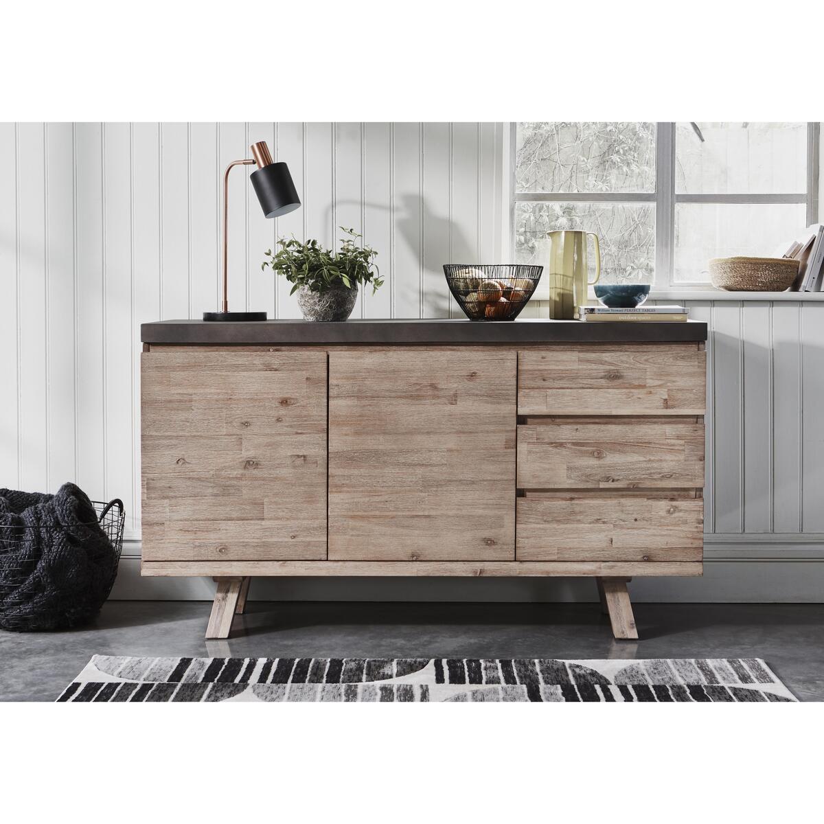 The aptly named Fusion collection of living room and dining room furniture melds two on-trend finishes – concrete and rustic wood – in a fabulous twist on modern industrial style. Pieces showcase eye-catching concrete tops, bold and chunky, juxtaposed with sturdy brushed acacia wood frames. This contemporary range includes dining tables, a dining chair and dining bench, occasional tables and storage pieces, and a wide choice of dining sets with versatile seating options. Cool, contemporary and incredible value. With its fabulous concrete top and beautiful brushed acacia wood frame, this contemporary industrial sideboard brings cool urban style, as well as spacious storage, to your dining room. Why you’ll love it. Great-value large sideboard with a very unique look. A contemporary twist on industrial style. Chunky square-edged concrete top. Gently rustic brushed acacia wood frame. Sturdy angled legs. Wood frame has a protective matt lacquer finish so it’s easy to look after. Crafted with care. What you need to know. Made with solid acacia wood. Concrete top is fibre-reinforced for durability. Double cupboard with adjustable shelf and 3 drawers. Wood has natural markings, knots and colour variations. Concrete top may show some small imperfections. This piece is heavy – please take care when moving it. Use coasters and placemats to protect the surface. Clean with dish soap and warm water, and dry immediately using a lint-free cloth. The Fusion range includes a compact sideboard, TV units, dining sets and more. WARNING!. Furniture can tip over unexpectedly and cause injury. This item shall be fixed to a wall using the anti-tip kit provided with the furniture. Be sure to use the correct wall fixings suitable for the walls in your home.