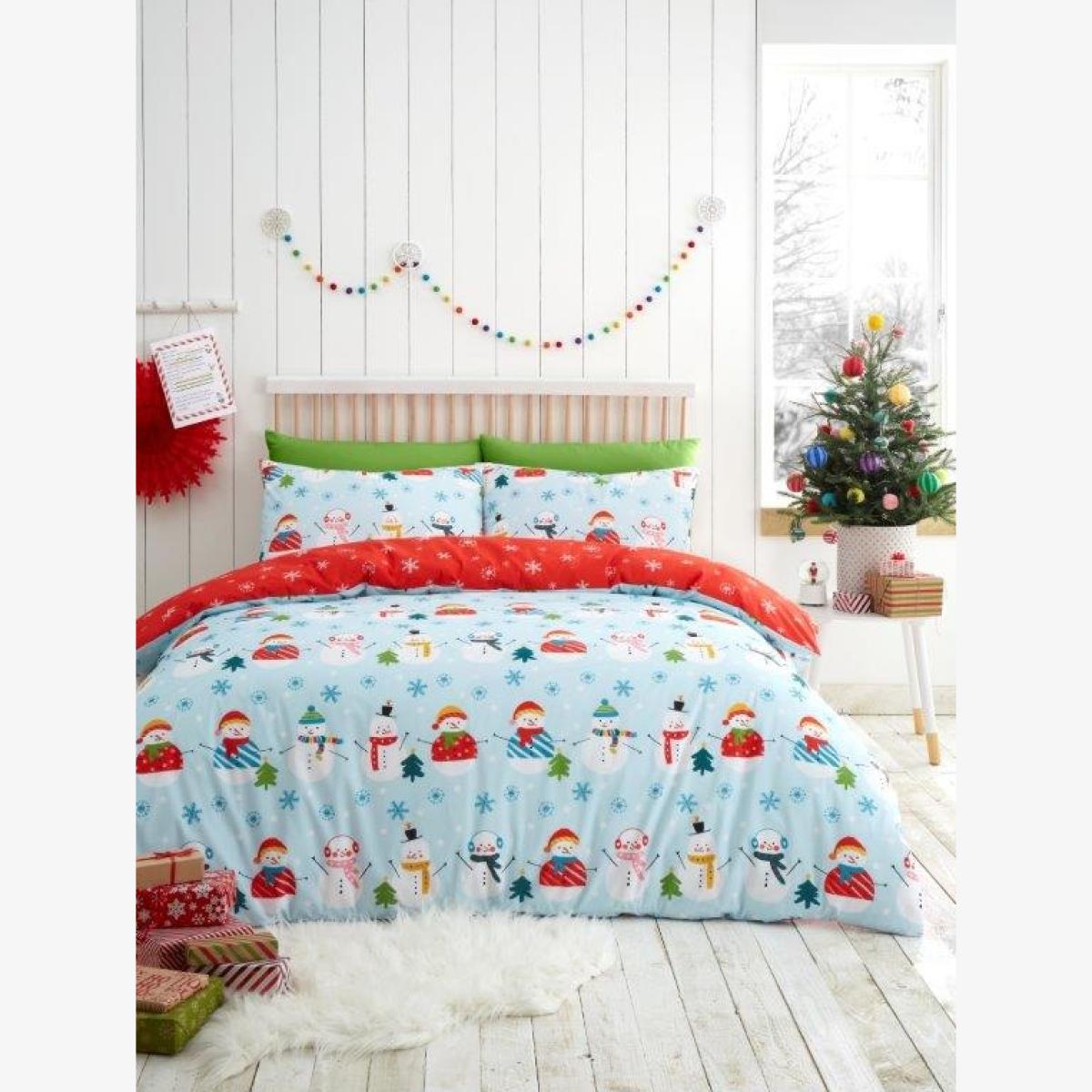 Snuggle up in festive style with the Christmas Snowmen duvet cover set by Fusion. This jolly set transforms your bedroom into a winter wonderland, bringing an abundance of joy and cheer. Imagine adorable snowmen, complete with carrot noses and rosy cheeks, frolicking amidst glistening snowflakes on a delightful duck egg background. It's the perfect blend of whimsy and elegance, making your bed the center of attention this holiday season. The reverse side features an enchanting display of all-over snowflakes on a festive red background, adding a pop of merry merriment to your sleep space. Crafted from easy-care fabric, this set ensures your Christmas dreams are as stress-free as Santa's gift delivery. 100% Polyester Contents - Duvet Cover & Pillowcase/s (single x1, other sizes x2) Care Instructions Machine Wash Cool tumble dry. Dimensions Single 140 x 200cm Double 200 x 200cm King 225 x 200cm All screens vary in colour reproduction and whilst every effort has been made to display the colour as accurately as possible it is for guidance only