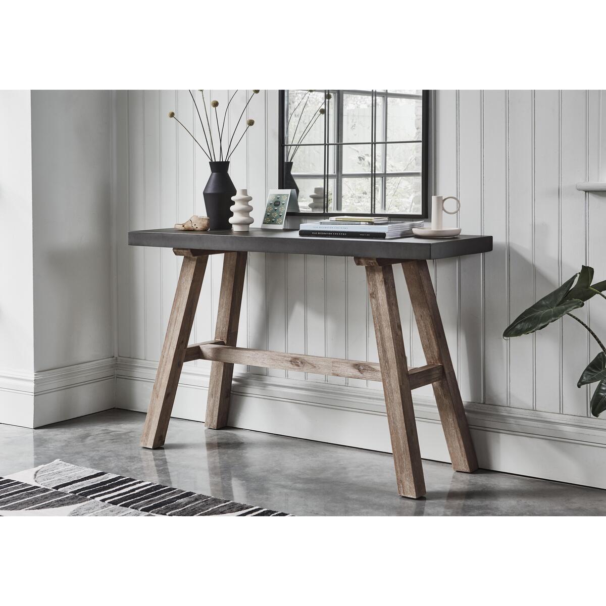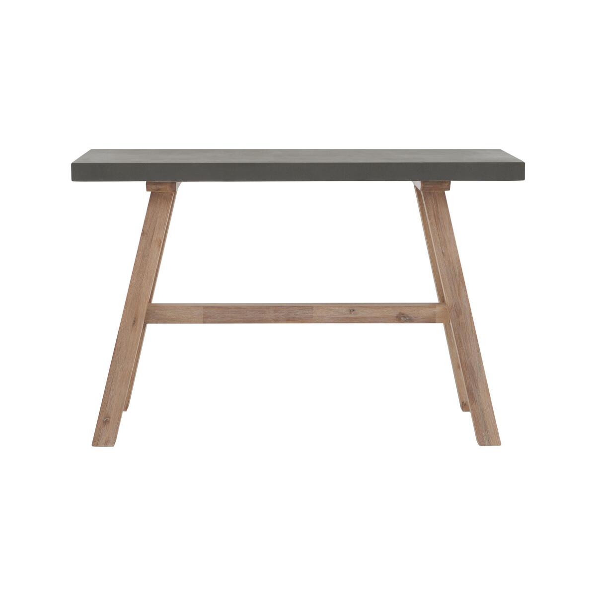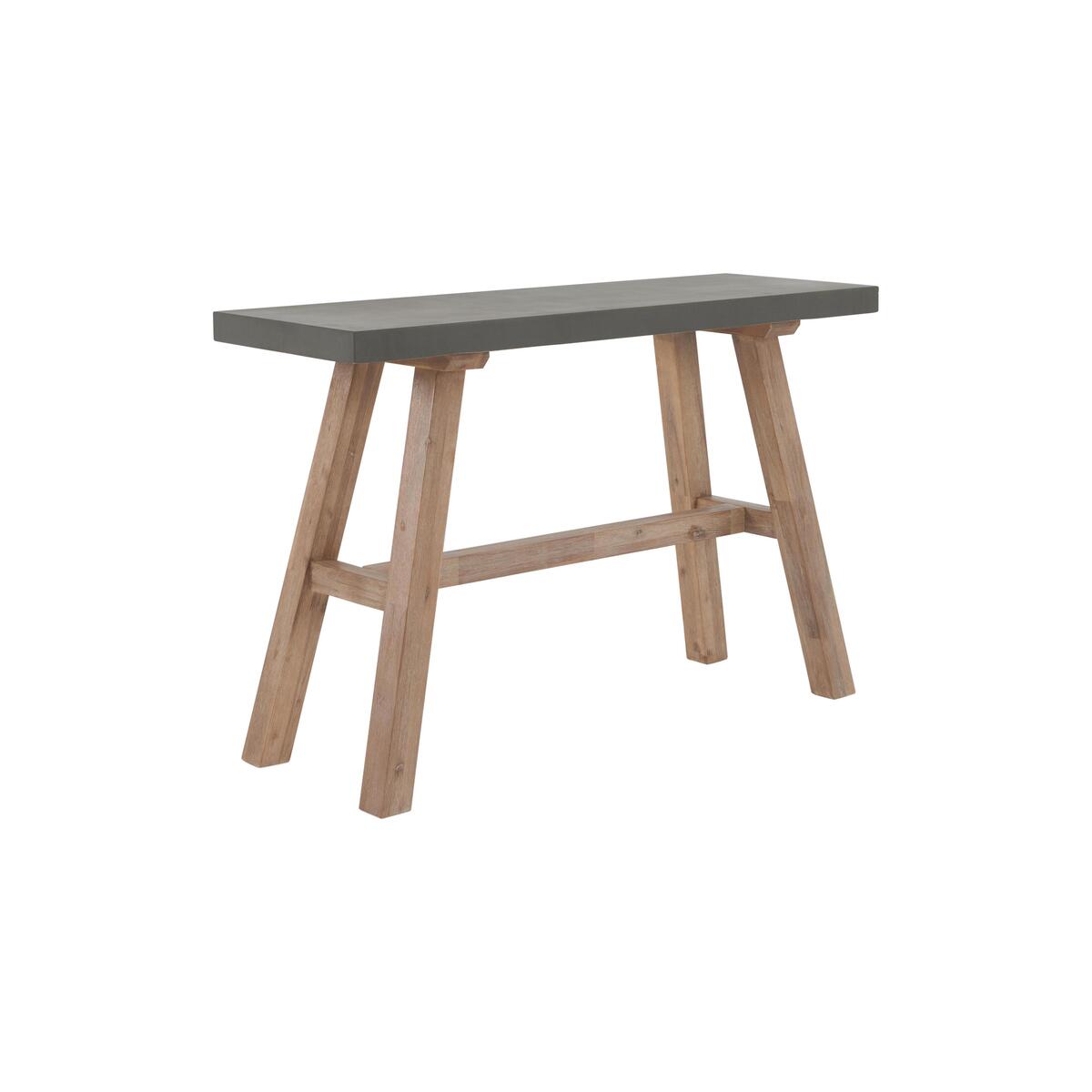 The aptly named Fusion collection of living room and dining room furniture melds two on-trend finishes – concrete and rustic wood – in a fabulous twist on modern industrial style. Pieces showcase eye-catching concrete tops, bold and chunky, juxtaposed with sturdy brushed acacia wood frames. This contemporary range includes dining tables, a dining chair and dining bench, occasional tables and storage pieces, and a wide choice of dining sets with versatile seating options. Cool, contemporary and incredible value. With its very cool concrete top and sturdy angled acacia wood legs, this useful hallway table delivers plenty of on-trend industrial style. Fantastic value, too. Why you’ll love it. Great-value console table with a very unique look. A contemporary twist on industrial style. Chunky square-edged concrete top. Sturdy H-frame angled base in brushed acacia wood. Wood base has a protective matt lacquer finish so it’s easy to look after. Crafted with care. What you need to know. Base is solid acacia wood. Concrete top is fibre-reinforced for durability. Wood has natural markings, knots and colour variations. Concrete top may show some small imperfections. This piece is heavy – please take care when moving it. Use coasters and placemats to protect the surface. Clean with dish soap and warm water, and dry immediately using a lint-free cloth. The Fusion range includes dining sets, a coffee table and a lamp table. WARNING!. Furniture can tip over unexpectedly and cause injury. This item shall be fixed to a wall using the anti-tip kit provided with the furniture. Be sure to use the correct wall fixings suitable for the walls in your home.