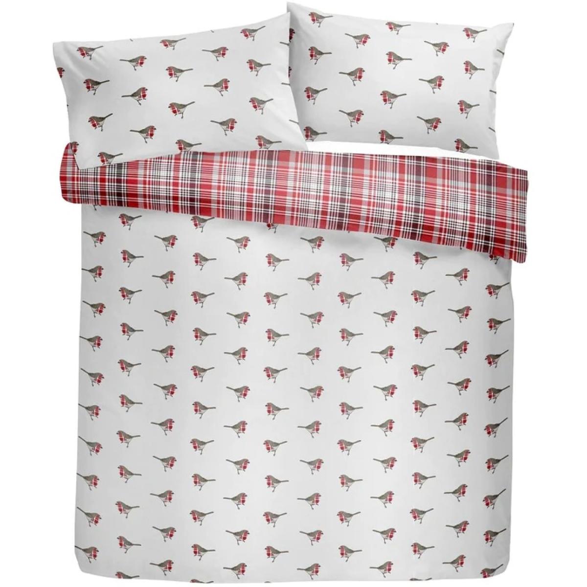 Created in super soft 100% brushed cotton and featuring a contemporary winter robin design on the front side and a striking tartan check design in complimentary colours to the reverse, this duvet set will make any bed wonderfully warm and inviting.   This bedding is fun and versatile and will see you through the winter months in comfort and style 100% brushed cotton Fully machine washable Single sets include one pillowcase Other sized sets include two pillowcases All screens vary in colour reproduction and whilst every effort has been made to display the colour as accurately as possible it is for guidance only.
