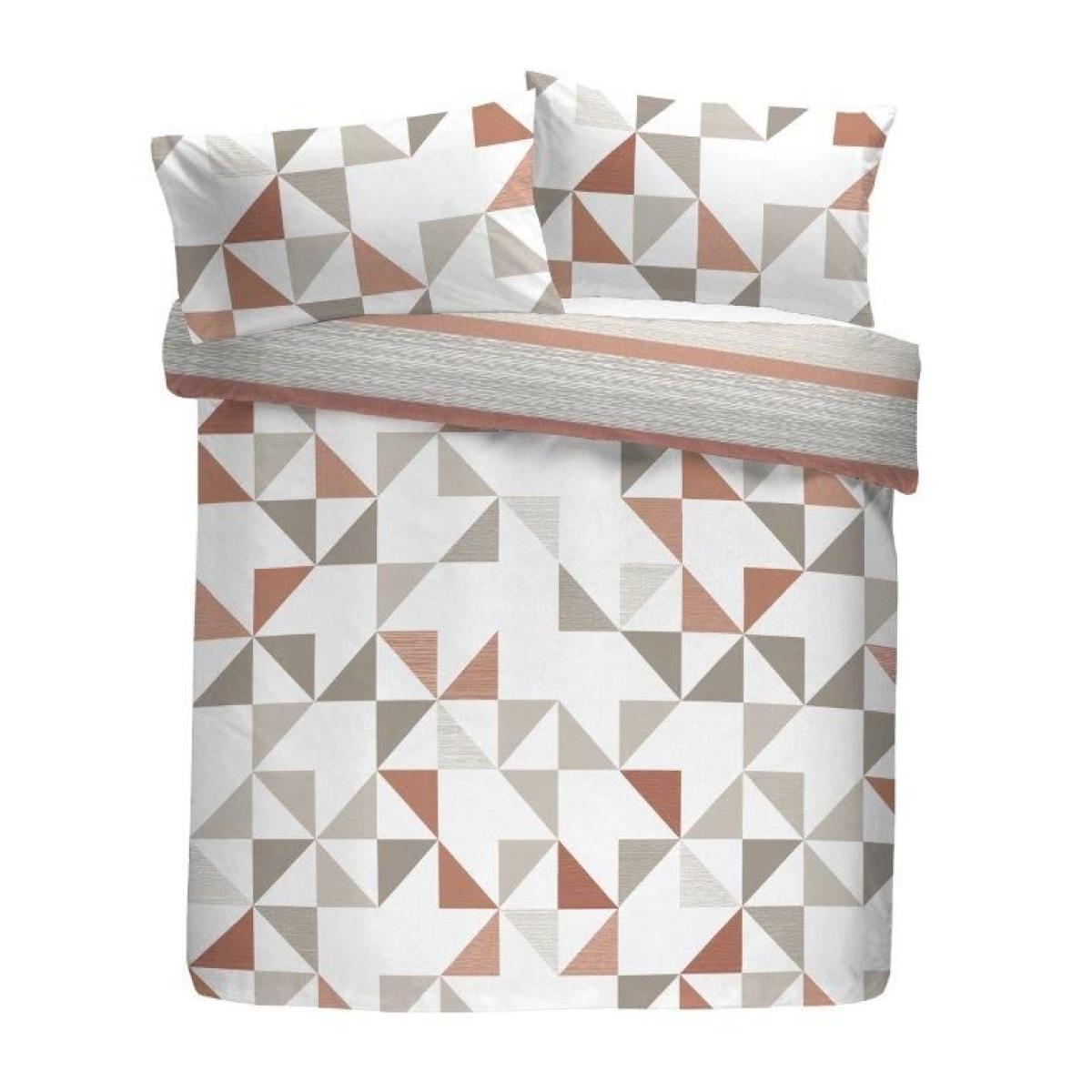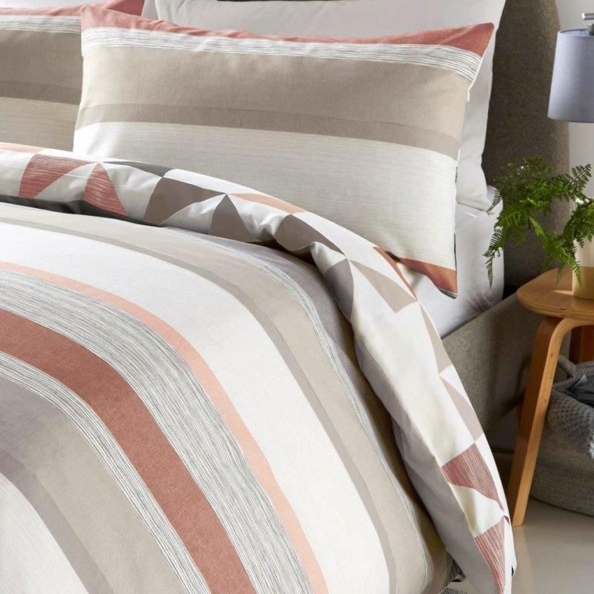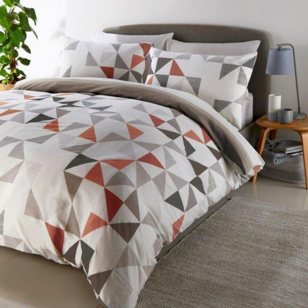 A contrasting reversible triangle and stripe duvet set combined with a modern red and grey colour palette suitable for today's contemporary bedrooms. Printed on easy care polycotton fabric to set a modern update on a classic design. 52% polyester, 48% cotton Machine washable All screens vary in colour reproduction and whilst every effort has been made to display the colour as accurately as possible it is for guidance only.