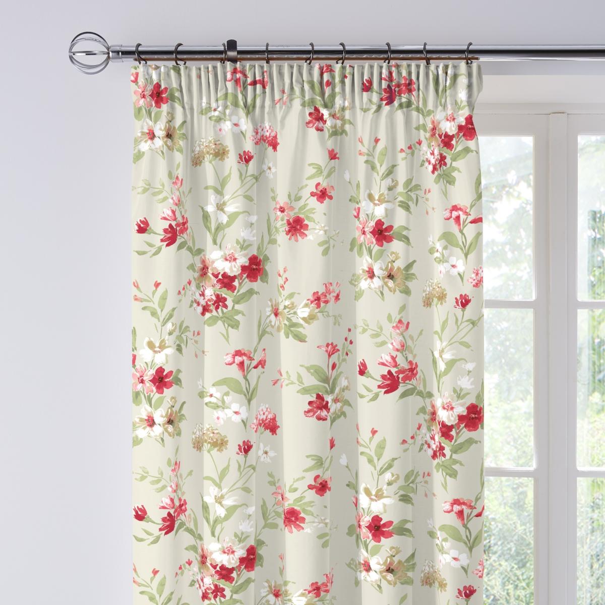 Stylish red and pink curtains with a classic floral trail design that will brighten up any room in your house available in a choice of three natural colours. This Jeannie design by Fusion features ready-made pencil pleat curtains with matching tie-backs and cushions to complete the look. Features: 70% Cotton/30% Polyester Blend Curtains are Packed in Pairs Tiebacks are not included in this purchase Care Instructions: Dry Clean Only Please note All screens vary in colour reproduction and whilst every effort has been made to display the colour as accurately as possible it is for guidance only.