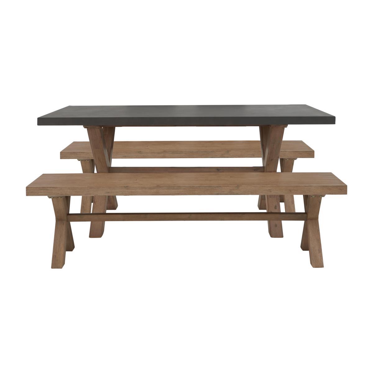 The aptly named Fusion collection of living room and dining room furniture melds two on-trend finishes – concrete and rustic wood – in a fabulous twist on modern industrial style. Pieces showcase eye-catching concrete tops, bold and chunky, juxtaposed with sturdy brushed acacia wood frames. This contemporary range includes dining tables, a dining chair and dining bench, occasional tables and storage pieces, and a wide choice of dining sets with versatile seating options. Cool, contemporary and incredible value. A bold look for any dining space, this great-value dining set combines contemporary industrial style with space-saving bench seating. And that concrete table top really delivers the wow factor. Why you’ll love it. Great-value dining set with a very unique look. A contemporary twist on industrial style. Table has a chunky square-edged concrete top. Sturdy X-shaped trestle base in brushed acacia wood. Solid acacia wood dining benches each seat up to 3. Wood has a protective matt lacquer finish so it’s easy to look after. Soft fabric upholstery with piped edges and buttoning. Chairs are exclusive to Furniture Village. What you need to know. Table base is solid acacia wood. Concrete top is fibre-reinforced for durability. Large dining table seats 8. Wood has natural markings, knots and colour variations. Concrete top may show some small imperfections. This dining table is heavy – please take care when moving it. Use coasters and placemats to protect the surface. Clean with dish soap and warm water, and dry immediately using a lint-free cloth. You can add the Fusion cushioned dining bench pad. The Fusion range includes a huge choice of dining sets, sideboards and tables.