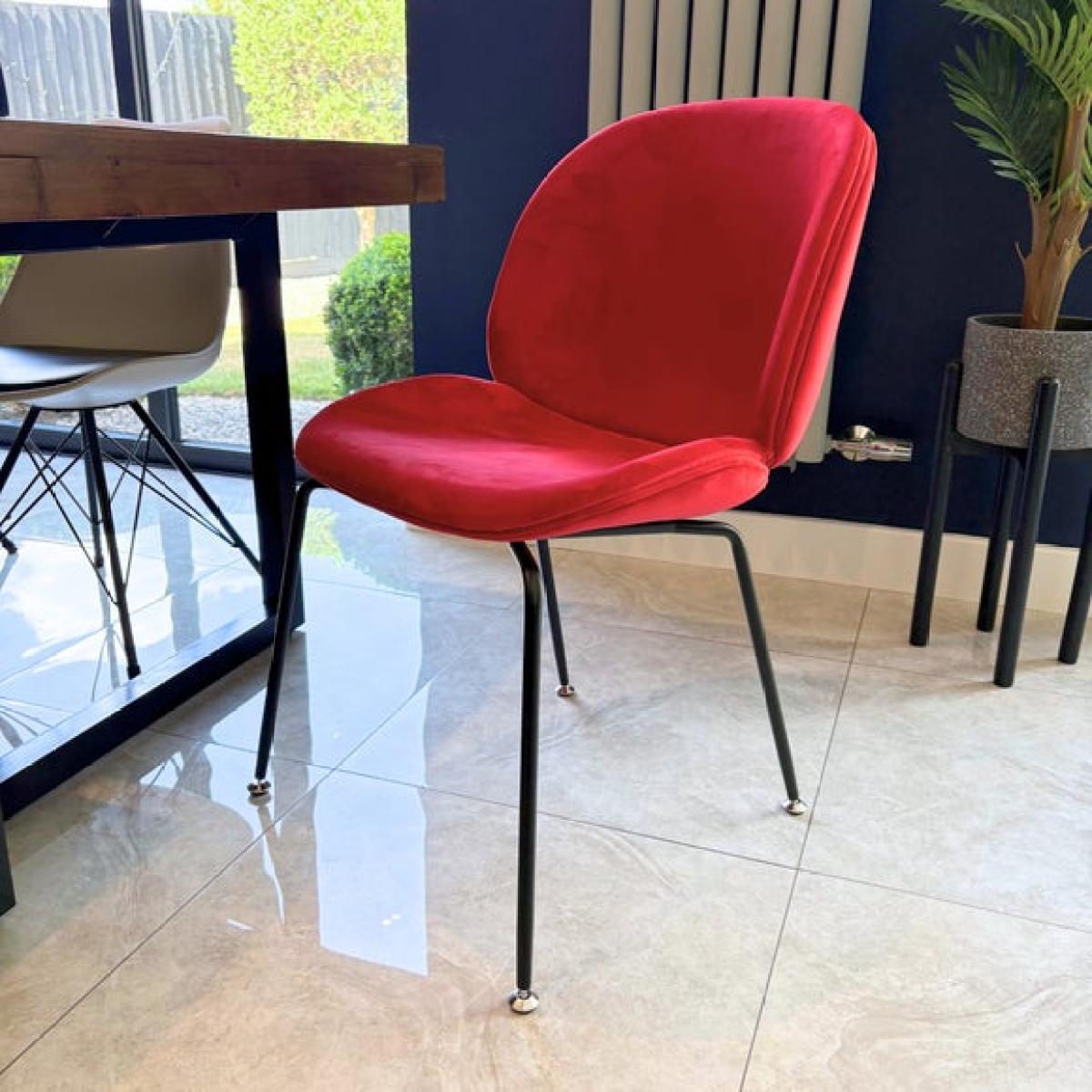 I love this velvet dining chair for its luxe texture and contemporary silhouette. The rich velvet adds a touch of elegance, making it a great choice for both modern and classic interiors. Its sleek black metal legs give it a minimalist feel, perfect for urban apartments or chic dining spaces. To style it effectively, consider pairing with neutral tableware and soft furnishings to let the chair stand out, or use it as a statement piece around a light wood table for a more balanced look. It works well in colour schemes that blend dark tones with plush fabrics, and I recommend keeping the surrounding decor simple to highlight its sophisticated appeal.