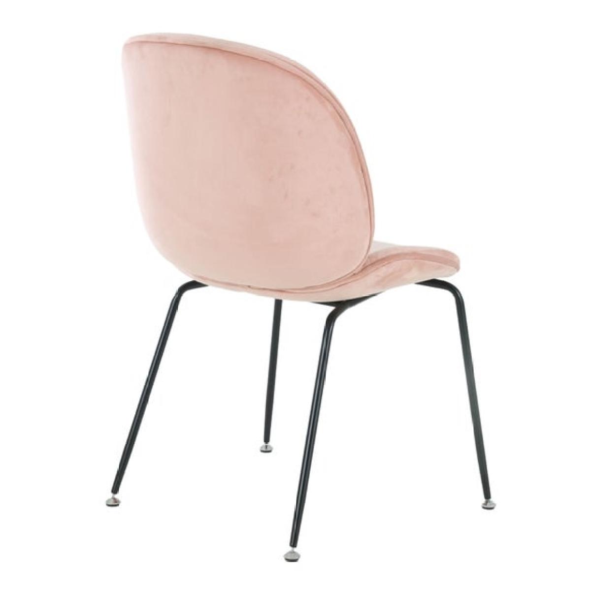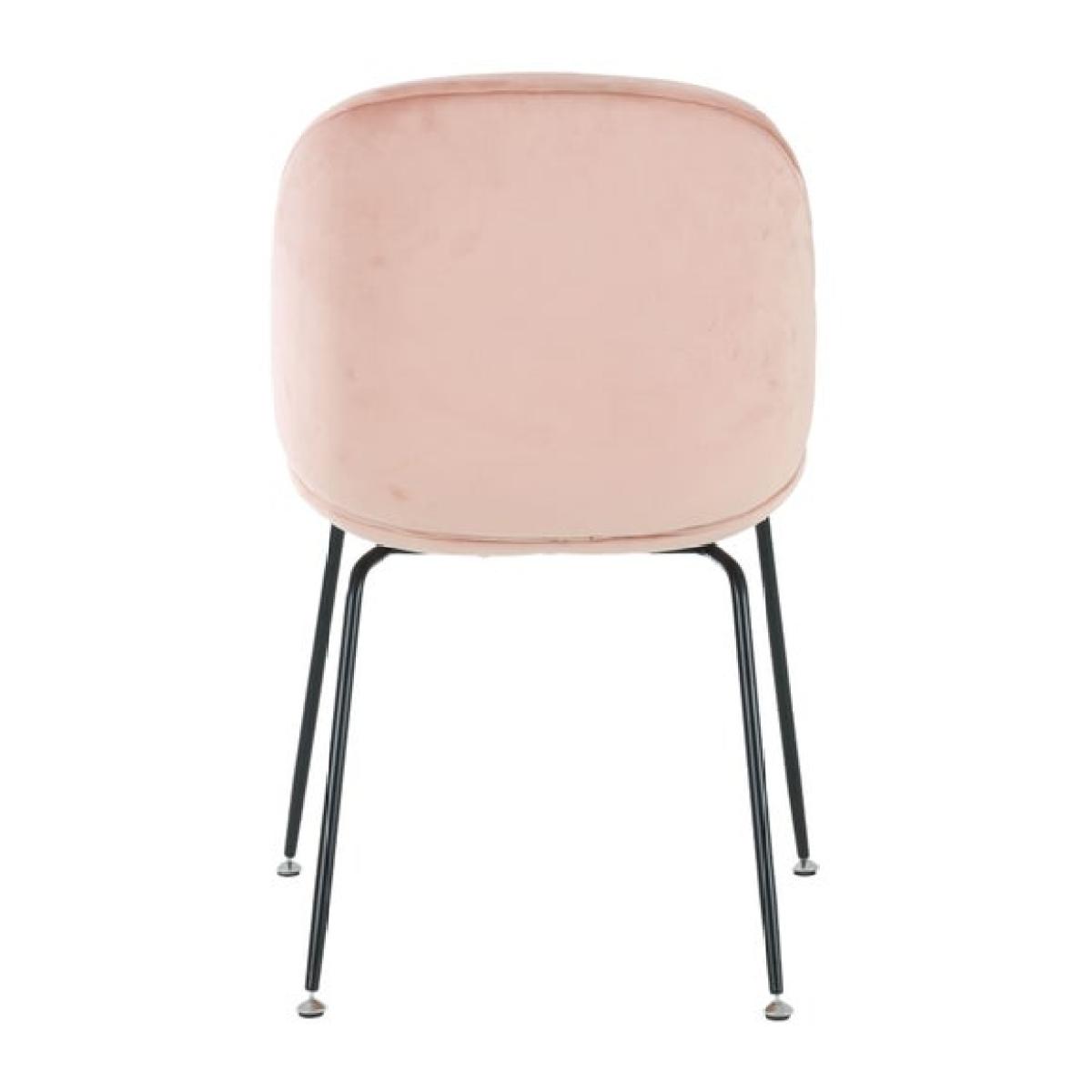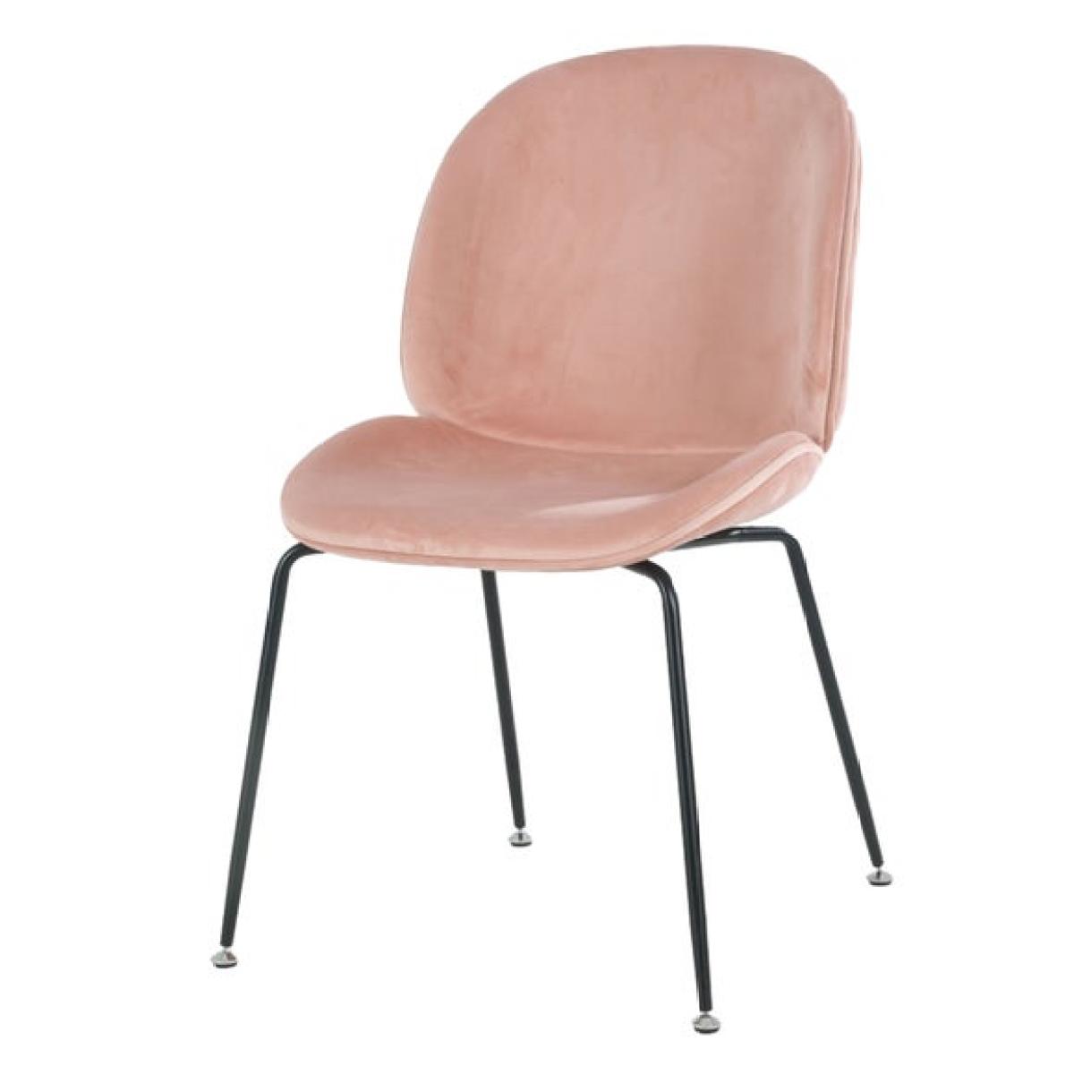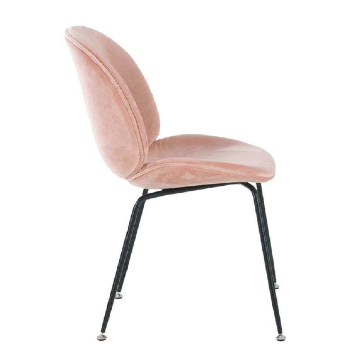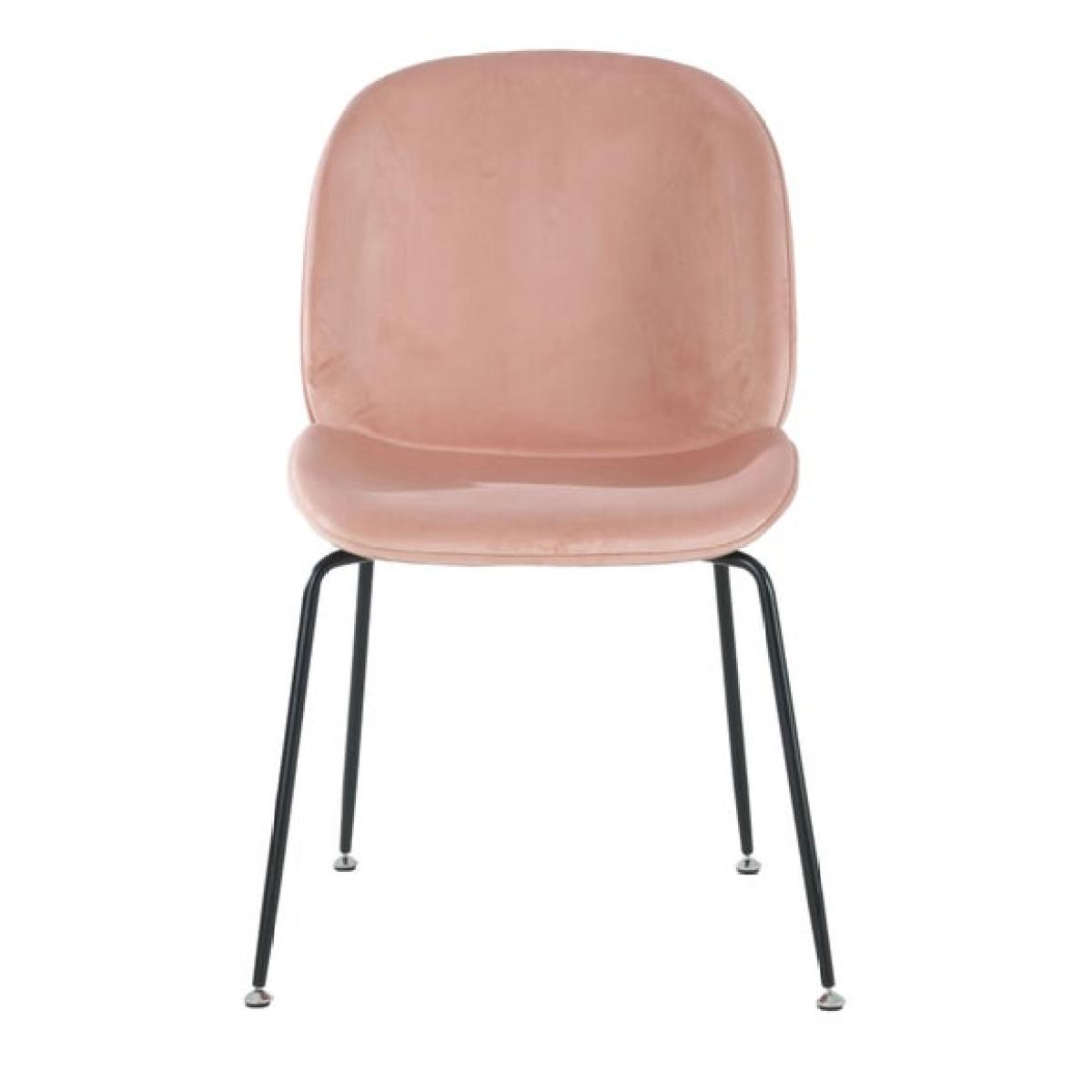I love this velvet accent chair for its sleek, sophisticated look and versatile appeal. Its soft pink hue adds a touch of luxury and works well in both contemporary and eclectic interiors. The black metal legs give it a modern edge, making it a great pairing with minimalist or industrial styles. Practical styling tips include using it as a statement piece in a living room or as a chic dining chair in a smaller space. It pairs beautifully with other metallic accents, neutral tones, or bold patterns, and its plush velvet finish invites comfort without sacrificing style.