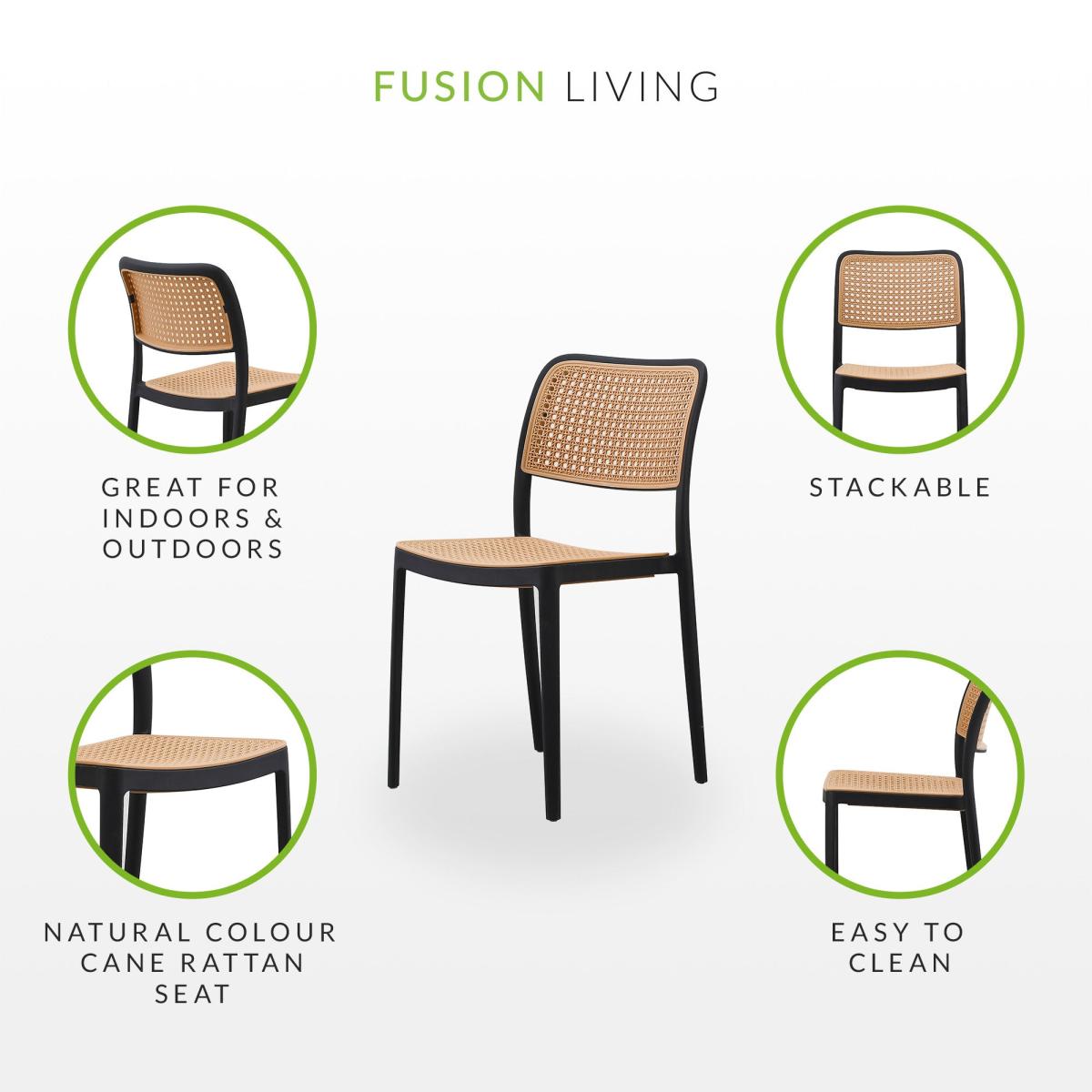 * Plastic moulded dining chair* For use indoor and outdoor * Easy to clean* Stackable* Light but durable A stylish and contemporary addition to your dining area, this plastic rattan cafe dining chair combines lightweight durability with a sleek retro look. The chair’s colour, paired with beautiful rattan detailing, enhances any interior, making it perfect for various decor styles. It provides both comfort and support, ensuring a pleasant seating experience. Easy to clean and stackable, this chair is practical for both indoor and outdoor use.