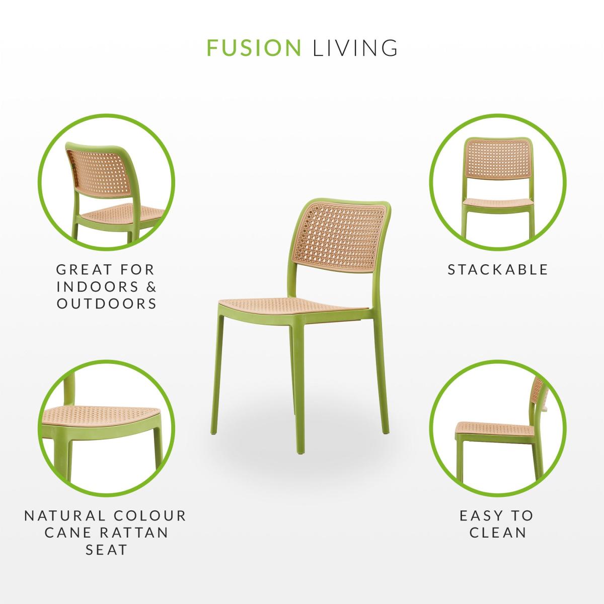 * Plastic moulded dining chair* For use indoor and outdoor * Easy to clean* Stackable* Light but durable A stylish and contemporary addition to your dining area, this plastic rattan cafe dining chair combines lightweight durability with a sleek retro look. The chair’s colour, paired with beautiful rattan detailing, enhances any interior, making it perfect for various decor styles. It provides both comfort and support, ensuring a pleasant seating experience. Easy to clean and stackable, this chair is practical for both indoor and outdoor use.