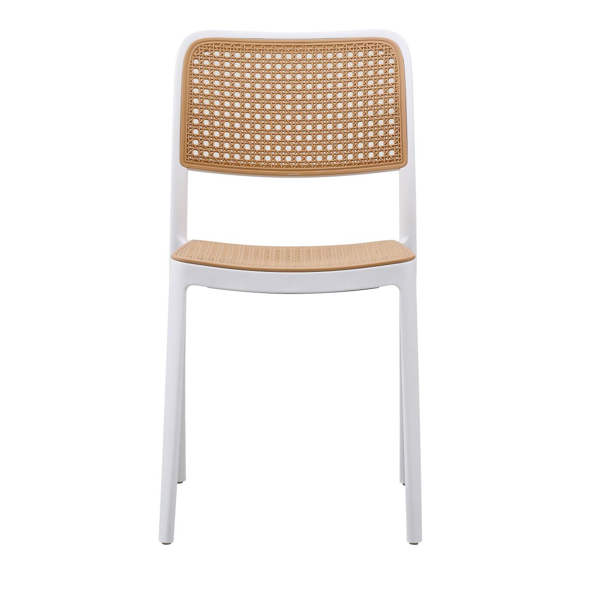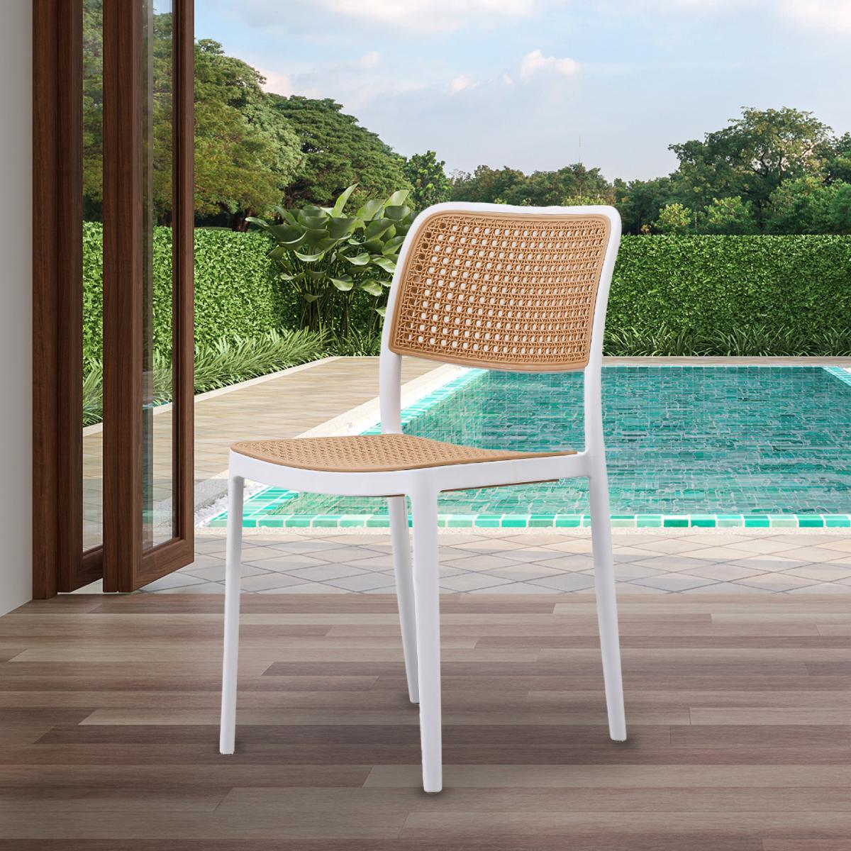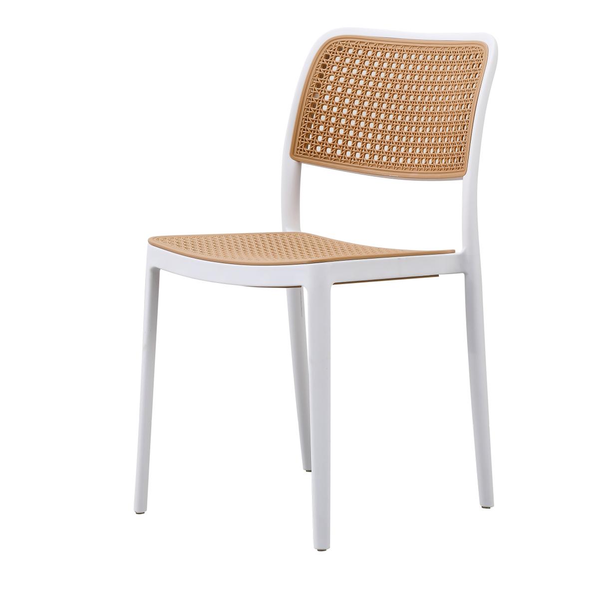 * Plastic moulded dining chair* For use indoor and outdoor * Easy to clean* Stackable* Light but durable A stylish and contemporary addition to your dining area, this plastic rattan cafe dining chair combines lightweight durability with a sleek retro look. The chair’s colour, paired with beautiful rattan detailing, enhances any interior, making it perfect for various decor styles. It provides both comfort and support, ensuring a pleasant seating experience. Easy to clean and stackable, this chair is practical for both indoor and outdoor use.