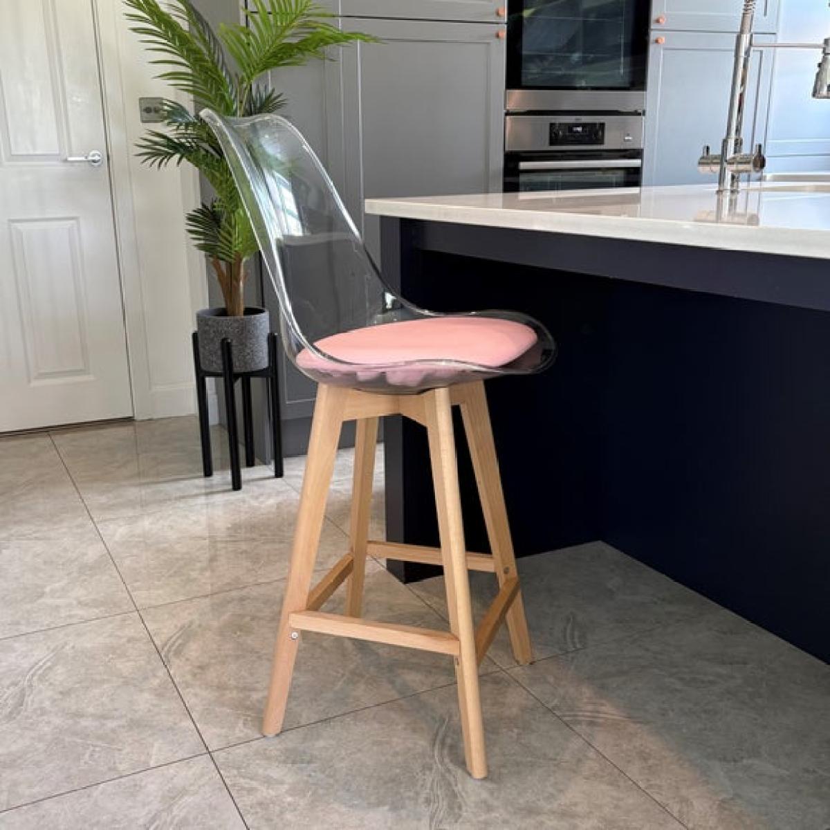 I really like this clear plastic stool for its modern, minimalist appeal and versatility. It works well in contemporary or Scandinavian interiors, especially when you want to keep the space feeling open and airy. Its transparent design helps it blend seamlessly into busy kitchens without feeling overpowering. Practical styling tips include pairing it with textured cushions or seat pads for added comfort and colour, like the pink one in the picture, which introduces a soft pop of colour. It’s also a great choice for smaller spaces as it doesn’t visually clutter, and it can easily be moved around for flexible seating arrangements. Overall, it’s a sleek, functional piece that combines style with practicality.