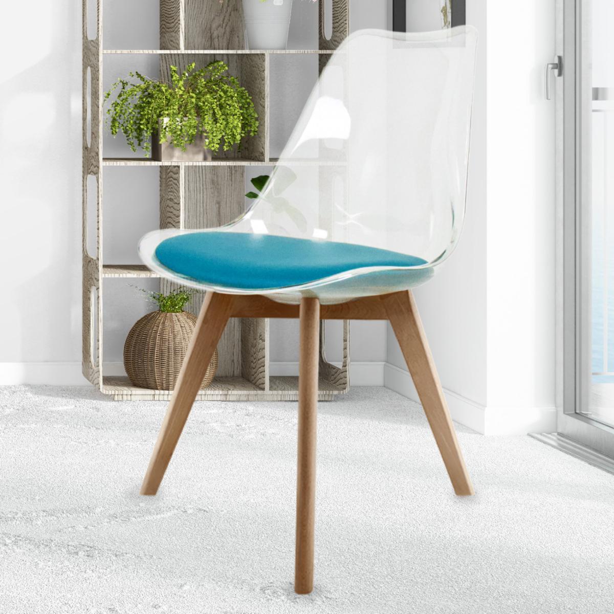 * Removable seat pad* Comfortable and durable* Easy to wipe clean with a damp cloth* Available in a variety of colours* Simple assembly with easy-to-follow instructions Part of a collection that effortlessly blends design and practicality, this chair features a transparent plastic curvaceous seat and a soft, easy-to-clean, colourful seat pad, making it both stylish and comfortable. The contoured, clear seat and four squared light wood legs not only look great but also provide exceptional sturdiness.