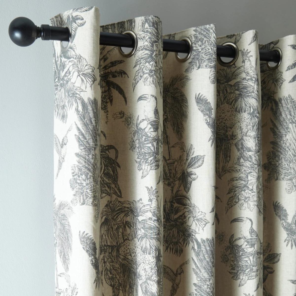 The Fusion Saranda are gorgeous, completely lined, cotton-linen-blend curtains have a tropical-inspired pattern that will look absolutely stunning in any interior decor. These curtains feature a ring top, eyelet heading that not only allows them to hang effortlessly, but also creates a beautiful drape. They are printed in a soft charcoal grey colour on a natural, linen-colored backdrop. 80% Cotton 20% Polyester Lining 100% Cotton Dry Clean only Lined Pair of Curtains Please note All screens vary in colour reproduction and whilst every effort has been made to display the colour as accurately as possible it is for guidance only.