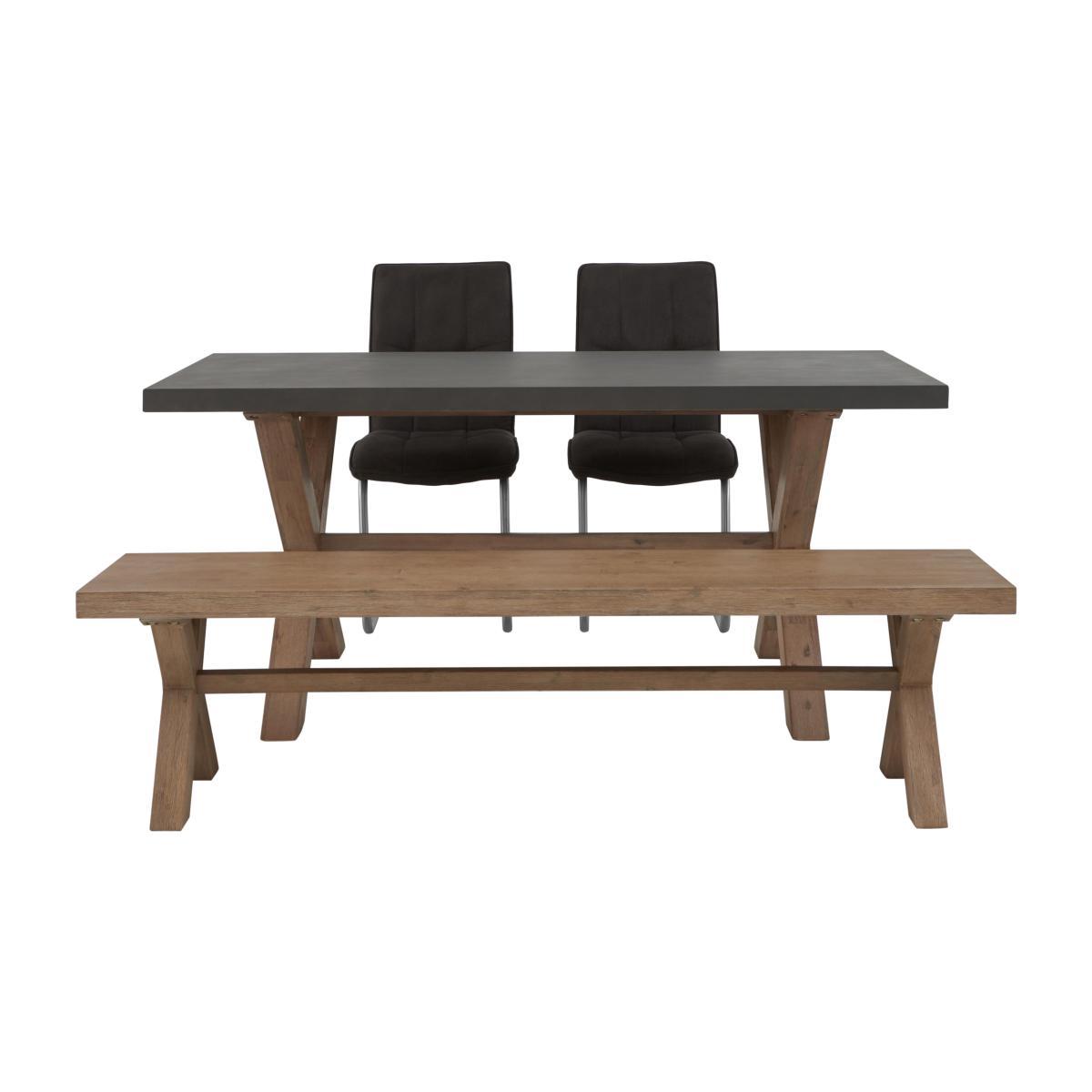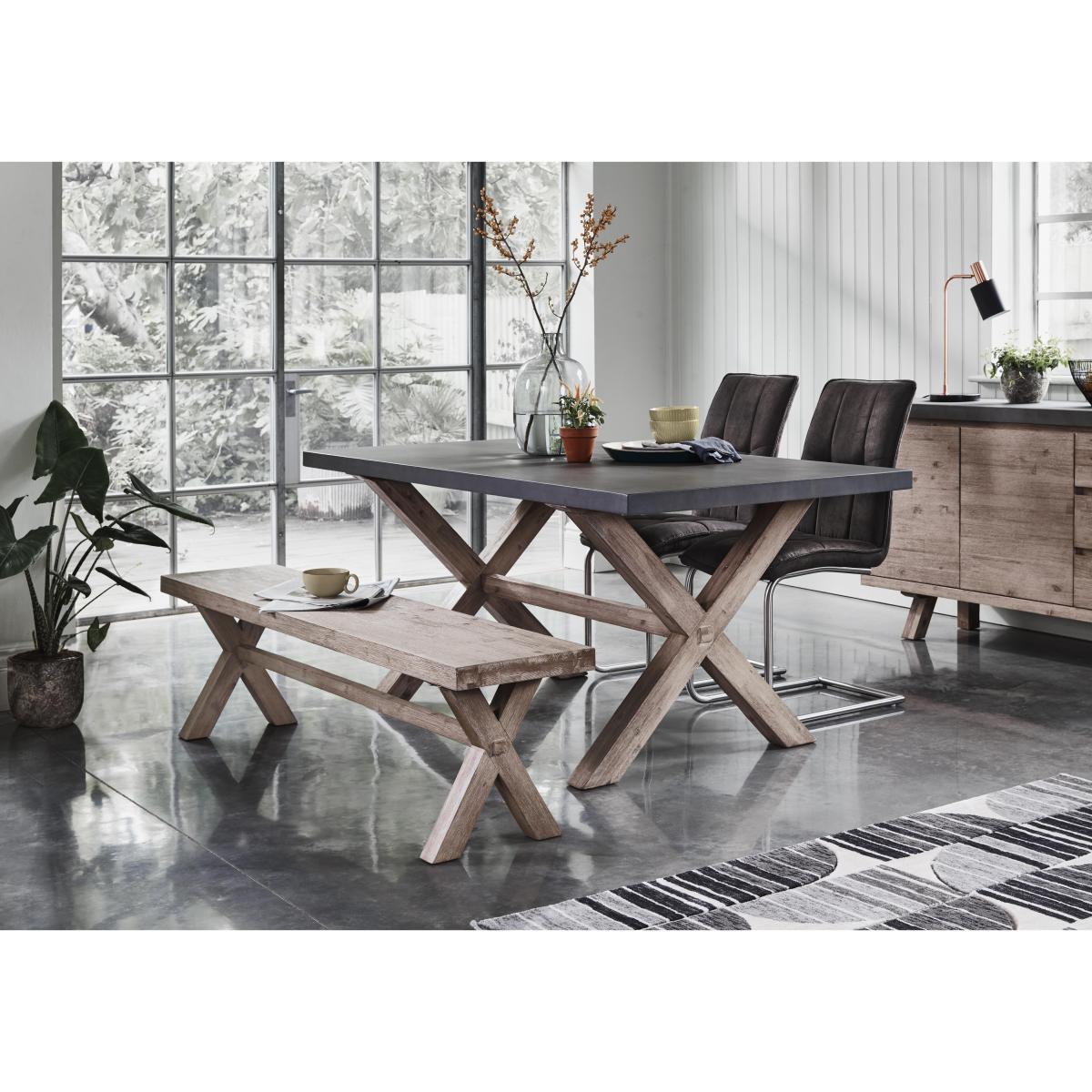 The aptly named Fusion collection of living room and dining room furniture melds two on-trend finishes – concrete and rustic wood – in a fabulous twist on modern industrial style. Pieces showcase eye-catching concrete tops, bold and chunky, juxtaposed with sturdy brushed acacia wood frames. This contemporary range includes dining tables, a dining chair and dining bench, occasional tables and storage pieces, and a wide choice of dining sets with versatile seating options. Cool, contemporary and incredible value. Cool industrial style, versatility and value for money – this contemporary dining set has it all. The concrete table top is eye-catching, and the combination of chairs and a bench is very family-friendly. Why you’ll love it. Great-value dining set with a very unique look. A contemporary twist on industrial style. Table has a chunky square-edged concrete top. Sturdy X-shaped trestle base in brushed acacia wood. Solid acacia wood dining bench seats up to 3. Wood has a protective matt lacquer finish so it’s easy to look after. Dining chairs have brushed steel cantilever bases and relaxed cushioning. Soft fabric upholstery with piped edges and buttoning. Choice of 3 colours. Chairs are exclusive to Furniture Village. What you need to know. Table base is solid acacia wood. Concrete top is fibre-reinforced for durability. Small dining table seats 6. Wood has natural markings, knots and colour variations. Concrete top may show some small imperfections. This dining table is heavy – please take care when moving it. Use coasters and placemats to protect the surface. Clean with dish soap and warm water, and dry immediately using a lint-free cloth. You can add the Fusion cushioned dining bench pad. The Fusion range includes a huge choice of dining sets, sideboards and tables.