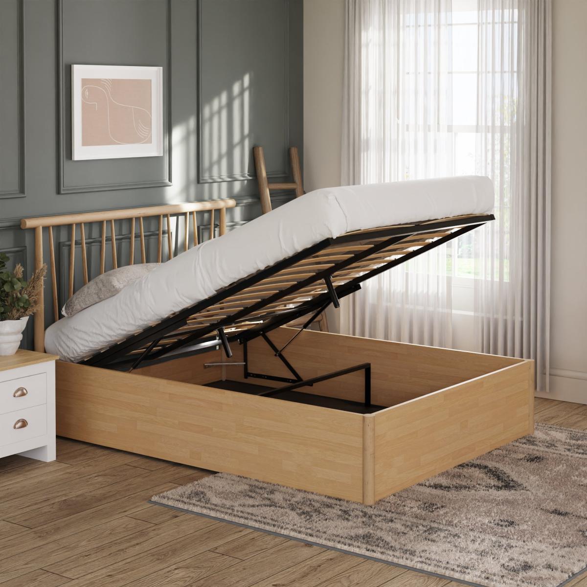 * Spindle headboard * Wooden frame * Lift-up ottoman * Modern style The Fusum Spindle Ottoman Bed combines traditional craftsmanship with modern practicality. Its elegant spindle headboard adds a refined touch, making it a stylish addition to any bedroom. The ottoman base offers generous hidden storage, perfect for keeping your space tidy and organised.