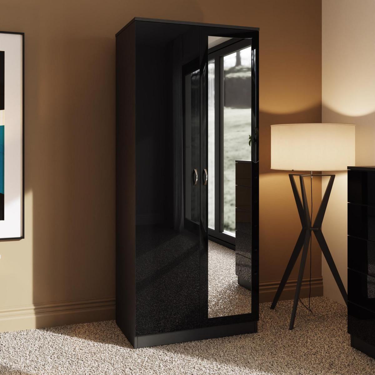The Black Gloss 2 Door Mirrored Wardrobe is an exceptional choice for enhancing your bedrooms functionality and style It features a sleek black gloss on the doors contrasted with a matte frame and includes a full length mirror that amplifies light and space Above the hanging rail a top shelf provides additional storage for items like linens or seasonal clothing This wardrobes scratch resistant surface ensures it remains a durable stylish fixture in your bedroom Built with durable MDF composite board for a sturdy foundation Each piece is coated with plastic veneer and melamine for added scratch resistance ensuring long lasting beauty The polished chrome metal bow handles add a touch of elegance to the collections minimalist design The matt finish frame contrasts with the gloss door fronts creating a modern and visually appealing look Whether you are seeking extra storage or a complete bedroom makeover this collection delivers on both form and function
