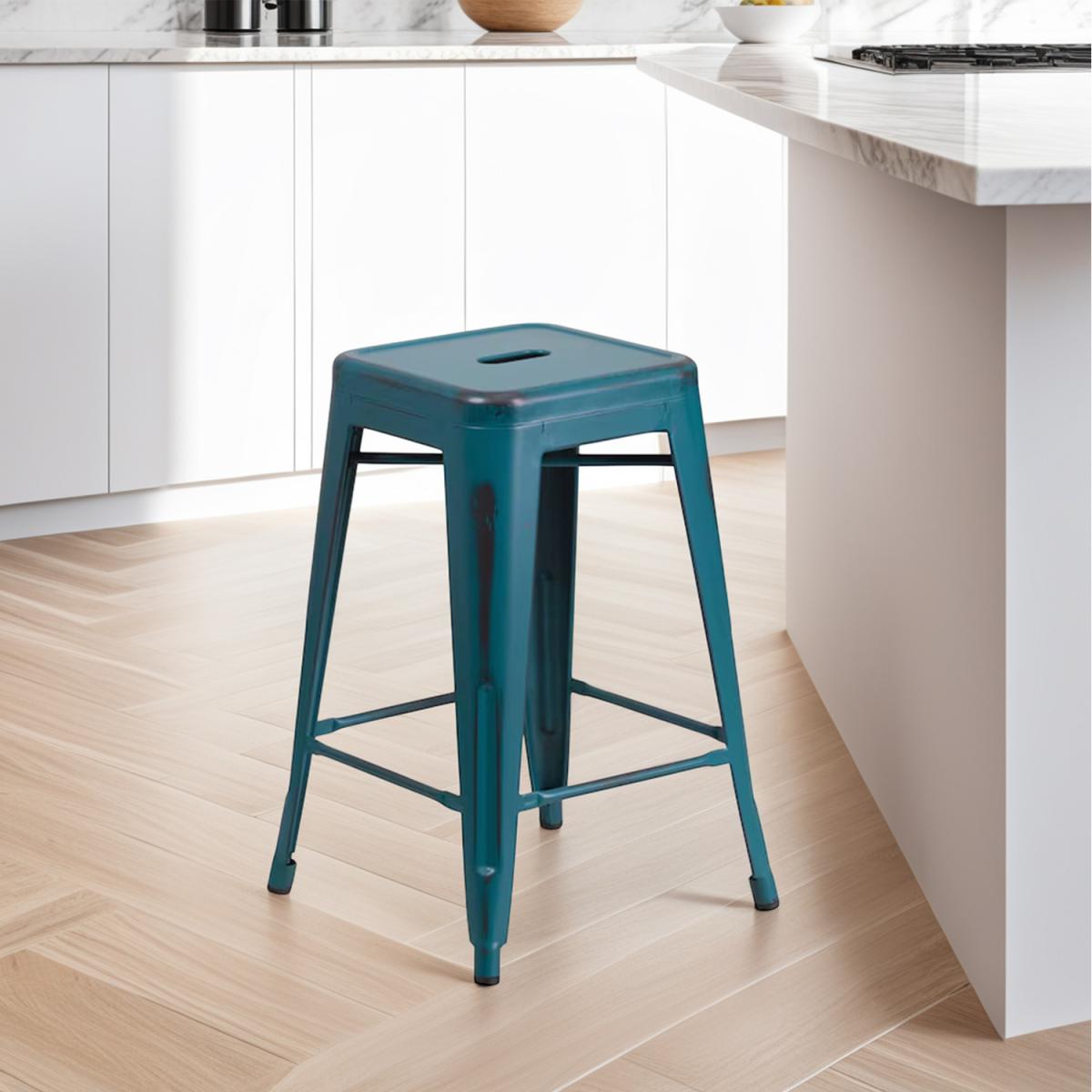 Industrial Metal Counter Stool Blue Teal Add a bold stylish touch to your home or commercial space with our industrial metal counter stool Designed with a timeless backless silhouette and clean lines this counter height stool delivers a sleek urban inspired look that complements everything from modern farmhouse kitchens to contemporary lofts Crafted from heavy duty weather resistant metal with a distressed finish this stool is both durable and versatile perfect for indoor dining areas kitchen islands basement bars or casual outdoor patios The integrated footrest and reinforced cross bracing provide added comfort and support making it ideal for everyday use in high traffic spaces like cafes restaurants and break rooms Looking to add personality to your space Mix and match colors and heights for a custom seating arrangement that reflects your style The built in drain holes in the seat help prevent water buildup making these stools a smart option for covered outdoor use as well Whether you are designing a cozy breakfast nook or upgrading your bar area this metal counter stool combines form and function to elevate any setting with industrial charm and long lasting performance Dimensions Delivered Assembled Height 61cm Width 43cm Depth 43cm Product Features Industrial Inspired Design Clean lines and a distressed metal finish offer a timeless minimalist look that fits modern farmhouse urban loft and industrial style spaces Durable Metal Construction Built from heavy duty steel for long lasting performance in both residential and high traffic commercial settings like restaurants bars and cafes Indoor and Outdoor Versatility Weather resistant with built in drain holes in the seat ideal for covered patios kitchen islands basement bars and more For best results avoid prolonged exposure to moisture Comfortable and Supportive Seating Integrated footrest and lower support braces enhance stability and offer ergonomic comfort for extended sitting Backless Stackable Design Space saving stackable design allows for easy storage when not in use great for dynamic spaces and multi use areas