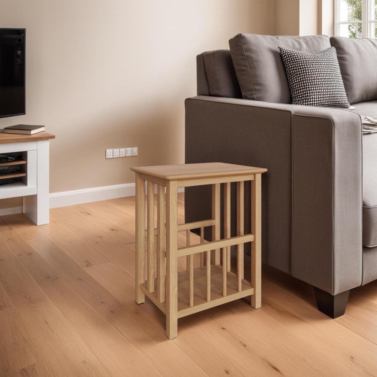 Crafted from a combination of solid oak, MDF, and oak veneer, this magazine table is manufactured from the highest quality materials. The solid oak construction ensures durability and strength, while the oak veneer and MDF components contribute to its sleek and elegant appearance. The Magazine Rack is compact and lightweight, making it easy to move from room to room as needed. The open design of the rack allows for easy access to your reading materials, ensuring that you can quickly grab what you need. This magazine rack features a durable and sturdy construction, ensuring that it will last for many years to come. The compact size of the rack makes it an excellent choice for smaller spaces, such as apartments, dorm rooms, or offices.