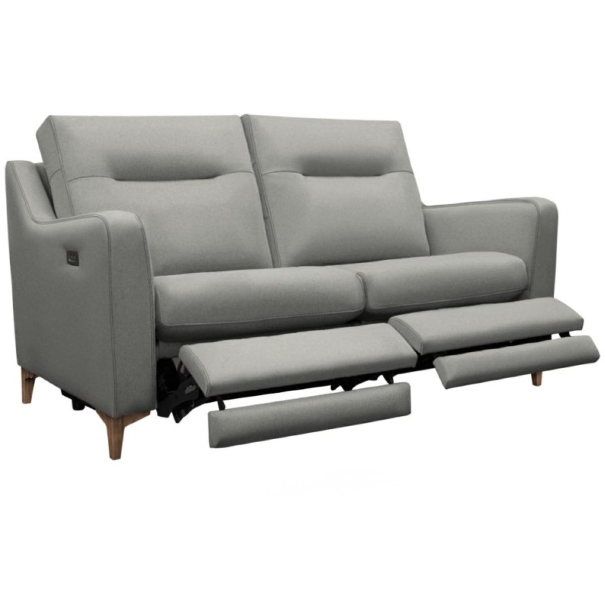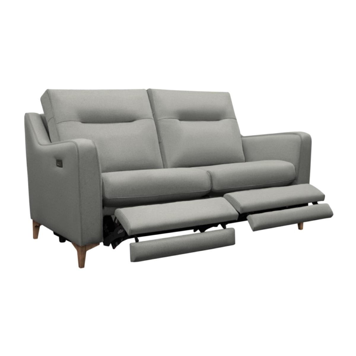 Introducing the G Plan Austen 2 Seater Leather Sofa with Double Powered Footrests and USB charging ports. Experience luxurious comfort with minimal modern living. Deeply filled cushions provide the ultimate comfort, while additional Power Footrest options offer extra support with the G Plan Austen range of sofas and chairs. Choose from Show Wood feet in ebony, walnut, oak, or mahogany, and select from a range of beautiful fabrics and leathers to suit your style. All power footrest options come with touch buttons and a USB charging port as standard. Recliner furniture is supplied on fixed feet only and in sections for ease of delivery. Handcrafted in the UK, each piece comes with a 25-year timber frame and frame construction guarantee. Features: Double Powered Footrests supplied for each seat Handy USB charging ports built into each arm as standard A choice of Show Wood feet is available. Choose from a range of beautiful fabrics and leathers Handcrafted in the UK 25-year timber frame and construction guarantee 2 Seater Sofa Dimensions Height: 99cm Width: 158cm Depth: 103cm Seat Height: 51cm Seat Width: 119cm Seat Depth: 55cm PLEASE NOTE: The G Plan Austen sofa is shown here in the Texas Charcoal leather with Walnut wooden feet. This image is an indication of what the cover may look like, we always recommend ordering swatch samples before ordering. All measurements are approximate and relate to the overall size of the item, including soft arm cushions where fitted and back cushions. All furniture is supplied on feet in a choice of show wood finishes. Available in a selection of fabrics and leathers. Seat cushions are a fixed type. All seat cushions and back cushions are non-reversible. Small & Large Double Power Footrest sofas are delivered in two sections which link together. Scatter cushions are available at extra cost.