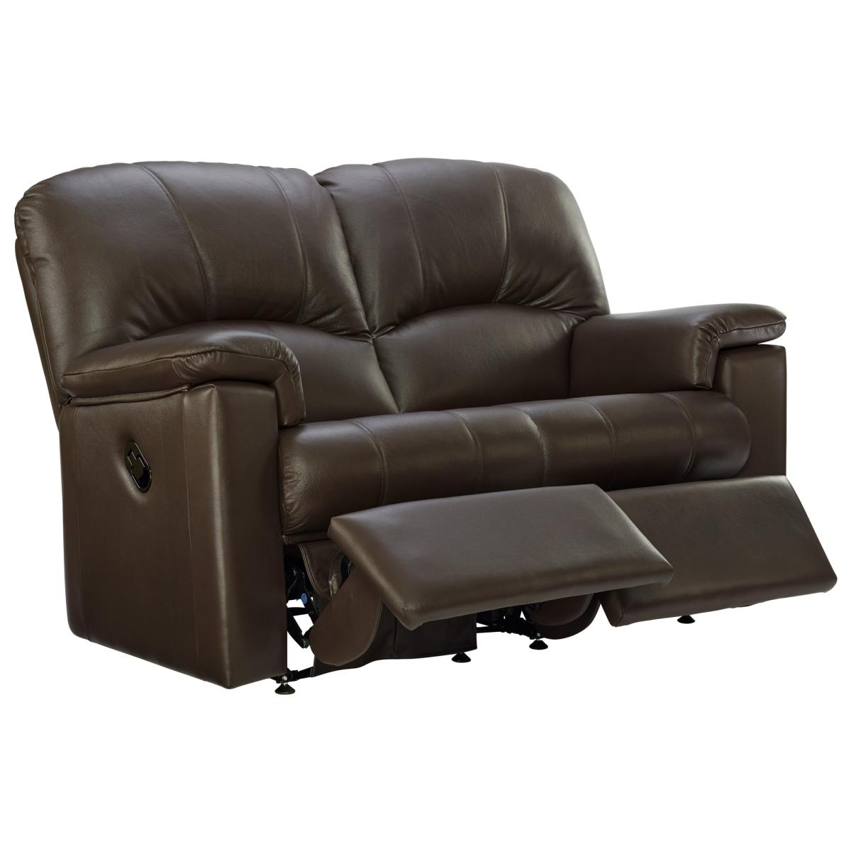 The G Plan Chloe 2 seater recliner sofa offers the perfect blend of compact size and ultimate relaxation, allowing you to lounge in comfort with adjustable reclining positions. It combines distinctive high-back design and bull-nose seat cushions for a stylish yet exceptionally comfortable seating experience. Its high-quality tailoring and generously padded arms contribute to a sense of well-being and relaxation. Available in a variety of beautiful fabrics and leathers, the Chloe can be tailored to suit your personal style. Shown here in Checkers Oyster and Checkers Putty fabrics and in Capri Chocolate leather. Features Distinctive high back and bull-nose seat cushions balance style with exceptional comfort. The high-quality tailoring and generously padded arms enhance feeling of wellbeing and relaxation. A shorter seat complements the back cushions to deliver a supportive upright sit. Recliner sofas are supplied in sections for ease of delivery. Recliner furniture is supplied on fixed feet only. Handcrafted in the UK with a 25 year timber frame & frame construction guarantee. Dimensions Height: 105cm Width: 163cm Depth: 100cm Seat Height: 56cm Seat Depth: 51cm Seat Width: 106cm Clearance needed for full recline: 70cm All measurements are approximate and relate to the overall size of the item including soft arm cushions where fitted and back cushions. All screens vary in colour reproduction and whilst every effort has been made to display the colour as accurately as possible it is for guidance only.
