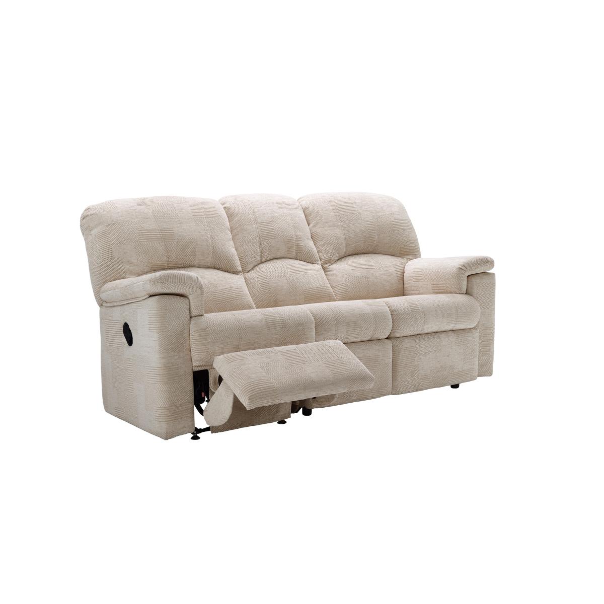• High backed, cushioned sofa from G Plan • Sprung seats, luxury fibre back cushions, bull-nose foam seat cushions • Fixed seat or with power or manual dual recliners • With a 10 year spring and frame guaranteeWhat more could you want? The G Plan Chloe three seater fabric recliner sofa, beautifully upholstered in fine and touchably soft fabric, combines softly curved style with optimum comfort. This large sofa is made from high quality materials by the master craftsmen at G Plan. Relax and enjoy the deep cushioning and inbuilt lumbar support. You can choose to have manual or power reclining options on the left, on the right, or on both sides if you wish. Choose a shade of upholstery to suit your décor. The G Plan Chloe three seater recliner sofa is part of the G Plan Chloe collection, beautifully made in the UK.Top tip:Some fabrics can show wear on areas of more use or in direct sunlight. To keep your fabric upholstery looking fresh, plump, turn and rotate seat and back cushions regularly if possible.