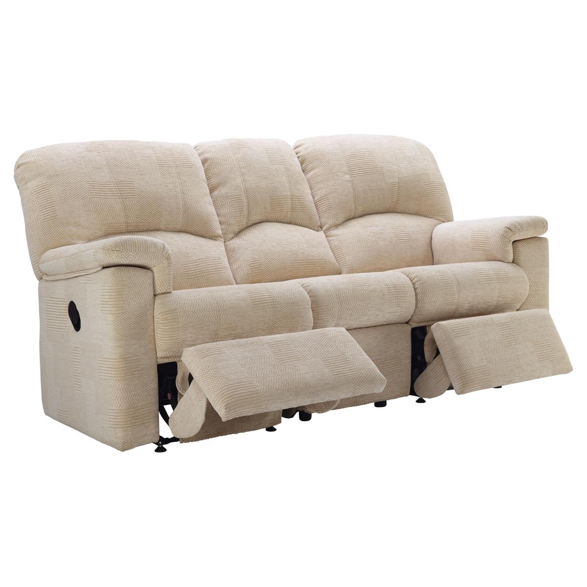 The G Plan Chloe 3 seater recliner sofa offers the perfect blend of compact size and ultimate relaxation, allowing you to lounge in comfort with adjustable reclining positions. It combines distinctive high-back design and bull-nose seat cushions for a stylish yet exceptionally comfortable seating experience. Its high-quality tailoring and generously padded arms contribute to a sense of well-being and relaxation. Available in a variety of beautiful fabrics and leathers, the Chloe can be tailored to suit your personal style. Shown here in Nebular Blush and Checkers Oyster fabrics and in Capri Chocolate leather.. Features. *Distinctive high back and bull-nose seat cushions balance style with exceptional comfort. *The high-quality tailoring and generously padded arms enhance feeling of wellbeing and relaxation. *A shorter seat complements the back cushions to deliver a supportive upright sit. *Recliner sofas are supplied in sections for ease of delivery. *Recliner furniture is supplied on fixed feet only. *Handcrafted in the UK with a 25 year timber frame frame construction guarantee. Dimensions. *Height: 105cm *Width: 212cm *Depth: 100cm *Seat Height: 56cm *Seat Depth: 51cm *Seat Width: 155cm *Clearance needed for full recline: 70cm All measurements are approximate and relate to the overall size of the item including soft arm cushions where fitted and back cushions. All screens vary in colour reproduction and whilst every effort has been made to display the colour as accurately as possible it is for guidance only..