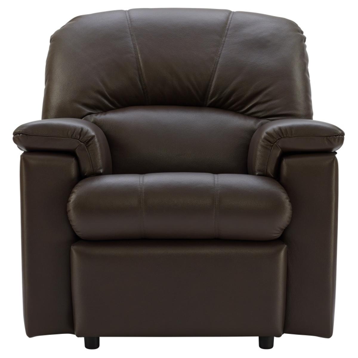 The G Plan Chloe armchair is available in small or standard size and offers the perfect blend of compact size and ultimate relaxation, allowing you to lounge in comfort with adjustable reclining positions. It combines distinctive high-back design and bull-nose seat cushions for a stylish yet exceptionally comfortable seating experience. Its high-quality tailoring and generously padded arms contribute to a sense of well-being and relaxation. Available in a variety of beautiful fabrics and leathers, the Chloe can be tailored to suit your personal style. Standard size chair shown here in Checkers Oyster fabric and Capri Chocolate leather. Small size chair shown here in Checkers Oyster fabric and Capri Taupe leather.. Features:. *Distinctive high back and bull-nose seat cushions balance style with exceptional comfort. *The high-quality tailoring and generously padded arms enhance feeling of wellbeing and relaxation. *A shorter seat complements the back cushions to deliver a supportive upright sit. *Handcrafted in the UK with a 25 year timber frame frame construction guarantee. Dimensions:. Standard Chair:. *Height: 105.4cm *Width: 100.3cm *Depth: 100.3cm *Seat Height: 56cm *Seat Depth: 51cm *Seat Width: 46cm Small Chair:. *Height: 97.8cm *Width: 87.6cm *Depth: 100.3cm *Seat Height: 51cm *Seat Depth: 51cm *Seat Width: 41cm All measurements are approximate and relate to the overall size of the item including soft arm cushions where fitted and back cushions. All screens vary in colour reproduction and whilst every effort has been made to display the colour as accurately as possible it is for guidance only..