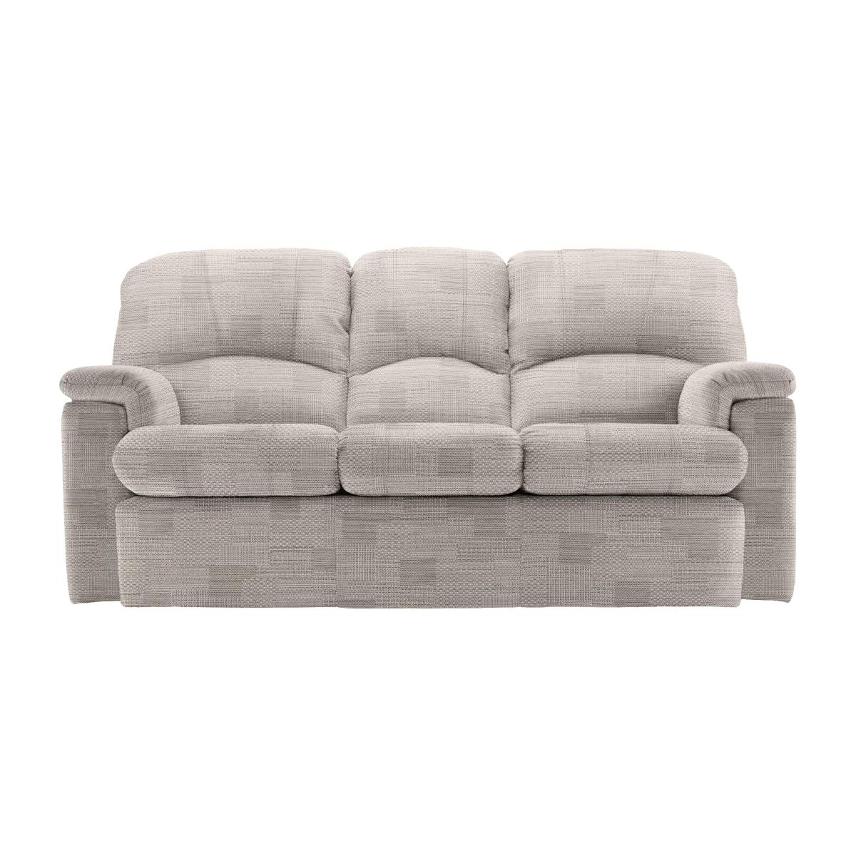. High backed, cushioned luxury from G Plan. Sprung seats, luxury fibre back cushions, bull-nose foam seat cushions. Fixed seat or with power or manual dual recliners. With a 10 year spring and frame guaranteeSmall, but perfectly formed, the G Plan Chloe small three seater fabric sofa has it all. It’s softly curved and stylish, and made by the master craftsmen at G Plan with your comfort in mind. And while it seats three people, it fits into a smaller room with ease. You can even choose from a range of stylish colours, to suit your décor. This compact sofa is covered with soft to the touch, fine fabric in your choice of shades. Some fabrics can show wear on areas of more use or in direct sunlight. To keep your fabric upholstery looking fresh, plump, turn and rotate seat and back cushions regularly if possible..