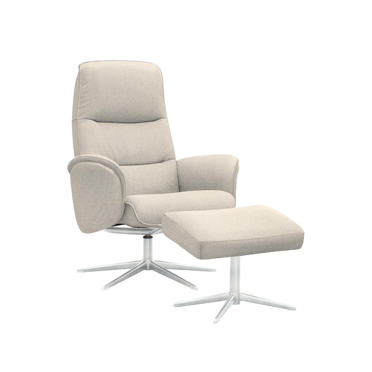 Comfort meets style in this swivel recliner chair and footstool set from British design house G Plan. Evoking cool 1970s style, each piece in the set features neat top stitching and a chrome-finished metal base. Why you'll love it Seriously comfortable swivel chair and footstool set from style icon G Plan. Eye-catching 1970s-inspired design. Chair swivels 360 degrees. Footstool is fixed. Superbly cushioned throughout. Seat back recline is manually adjustable. Choose from the entire G Plan fabric swatch book for the upholstery. Also available with 100% leather upholstery. Chair and footstool have chrome-finished metal bases. Find the G Plan Falum fabric swivel chair and footstool set only at Furniture Village. What you need to know Medium comfort level. Seat suspension: springs. Seat cushioning: foam. Seat cushion is fixed. Back suspension: cold-cured moulded foam. Back cushioning: cold-cured moulded foam. Back cushion is fixed. Please allow time for new recliners to ease. Minor gaps are necessary to ensure ease of recliner motion and may be exaggerated depending on floor type. Some fabrics can show wear on areas of more use or in direct sunlight. Clean regularly using a soft brush or vacuum with the curtain attachment. Deal with any spills promptly. Professional cleaning advised for oil- and grease-based stains. Please read our upholstery care guide for more advice. Item code: FALUCHSCB-001
