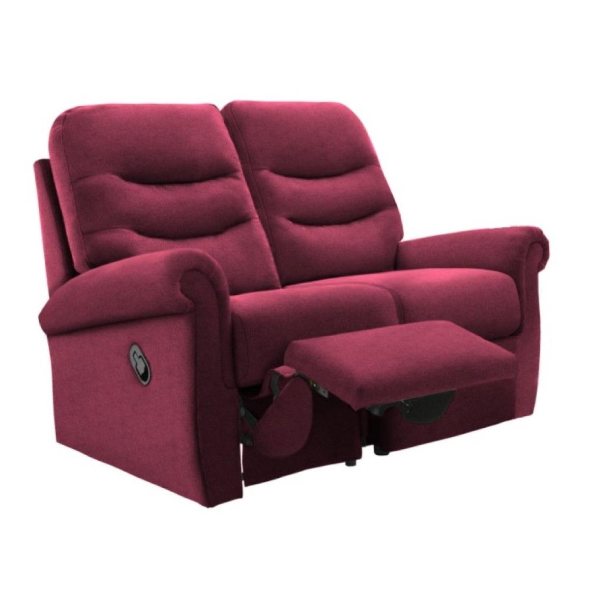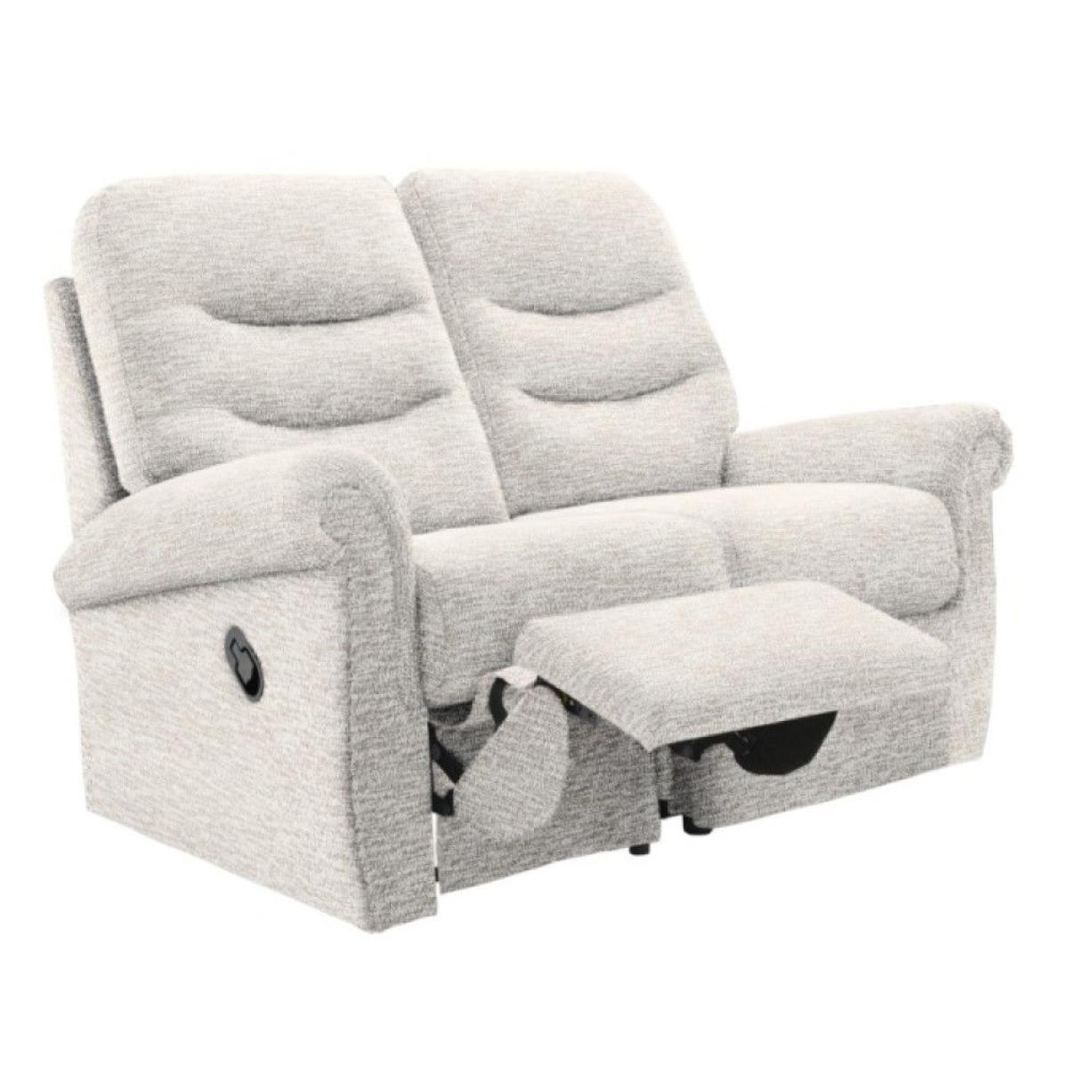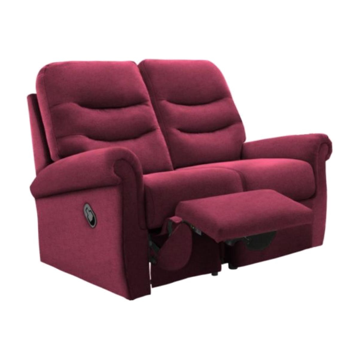 Classic in all of its design, Holmes offers an elegant take on G Plan's legendary comfort. A supportive high back and shorter seat offer an upright sit in a choice of standard and compact sizes. Stylish curves on the scroll arms, seat and back cushions soften the lines and ensure you are truly comfortable. Available in 13 models. LHF (left hand facing) the arm is on the left hand side of the unit when viewed from the front. RHF (right hand facing) the arm is on the right hand side of the unit when viewed from the front. All measurements are approximate and relate to the overall size of the item including soft arm cushions where fitted and back cushions. All furniture supplied on fixed feet. Available in soft fabric cover only. Arm caps available on all models in fabric cover only. Recliner available in manual or power versions with fixed seats. Standard furniture has removable seat cushions and are reversible. 2 seater recliner sofas are delivered in two sections which link together. 3 seater recliner sofas are delivered in three sections which link together. Scatter cushions are available at extra cost. Recliner sofas in this range are available as either single (Left hand facing or right hand facing) or double recliner, which feature a recliner mechanism on both sides. Our recliner furniture requires room to recline. This image is only an indication of what the cover would look like and is not a true representation. You should always request a swatch sample. Height: 105.4cm Width: 152.3cm Depth: 91.4cm Reclines: 5.1cm
