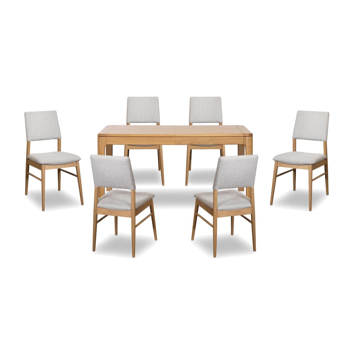 In the G Plan Maddison range of dining room and living room furniture, classic mid-century style – all effortless curves, soft silhouettes and tactile finishes that celebrate the beauty of solid oak – meets fashionable and practical designs for modern homes. Beautifully crafted by G Plan, the collection includes a wealth of thoughtful touches and clever details. The dining table extends from the middle, so that the table legs always stay tidily at the corners. Decorative details, like the range’s signature carved channels, are simple yet striking. And a choice of dining chair style allows you to create the formal or casual dining room set-up that you want. Chic mid-century dining style from British design icon G Plan. The solid oak Maddison dining set with six dining chairs has tactile curves and beautifully crafted details in a fashionable light oak finish. Why you'll love it On-trend mid-century style from master crafter G Plan. The solid oak extending dining table has a fashionable light oak finish. A refined silhouette with softly rounded edges. Designed to perfectly display the natural beauty of the woodgrain. Narrow decorative channel just under the table top. This table cleverly extends from the middle – the legs move as well as the top. This makes it easier to put more chairs along each side. The extra leaf is stored within the table when not in use. Seats 8 when extended. With 6 solid oak open back dining chairs. Elegant curves meet dining comfort. Cushioned and upholstered back rests and seat pads. Sophisticated neutral grey fabric upholstery. This dining set is part of the G Plan Maddison range. What you need to know Dining table and chairs are made of solid oak. This 160 cm dining table seats 6 and extends to 210 cm to seat 8. Oak and oak veneer surfaces will show variation in colour. Knots, filled knots and other markings are to be expected. Avoid placing in direct sunlight or close to a heat source. We recommend using placemats and coasters at all times. Item code: MADDT6CHSGRY-001