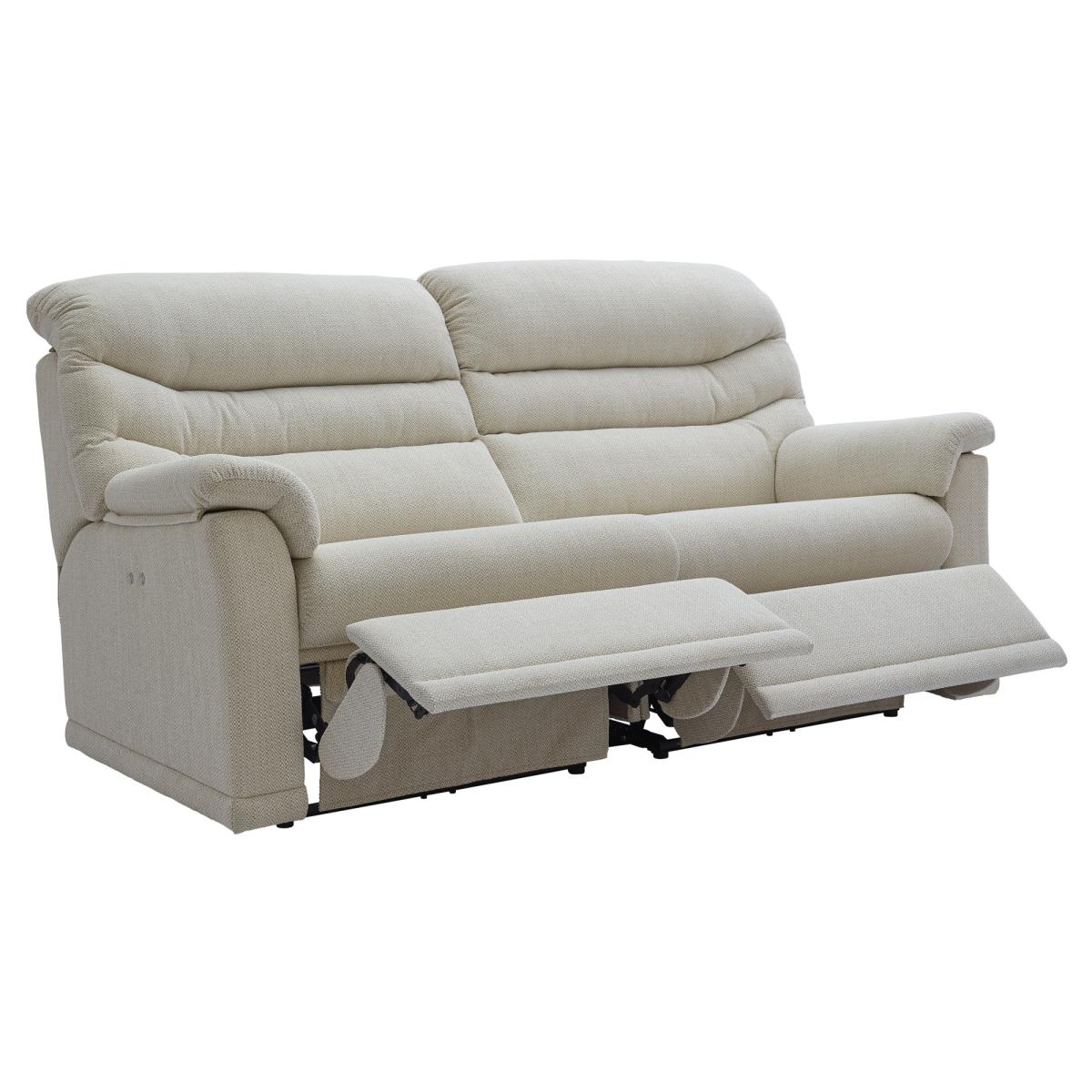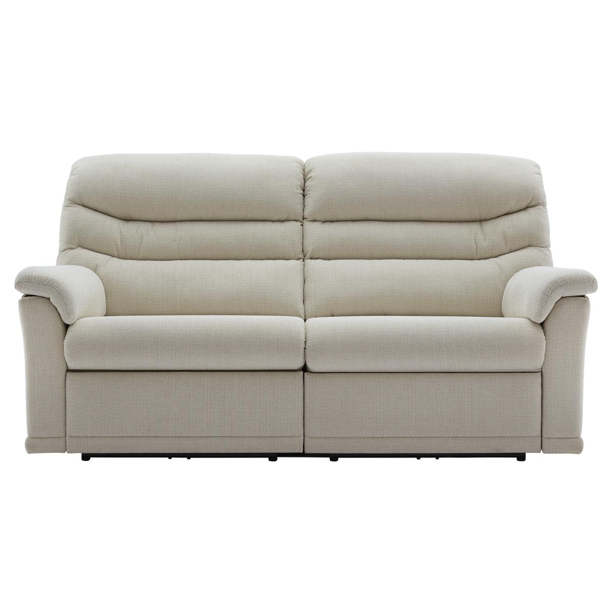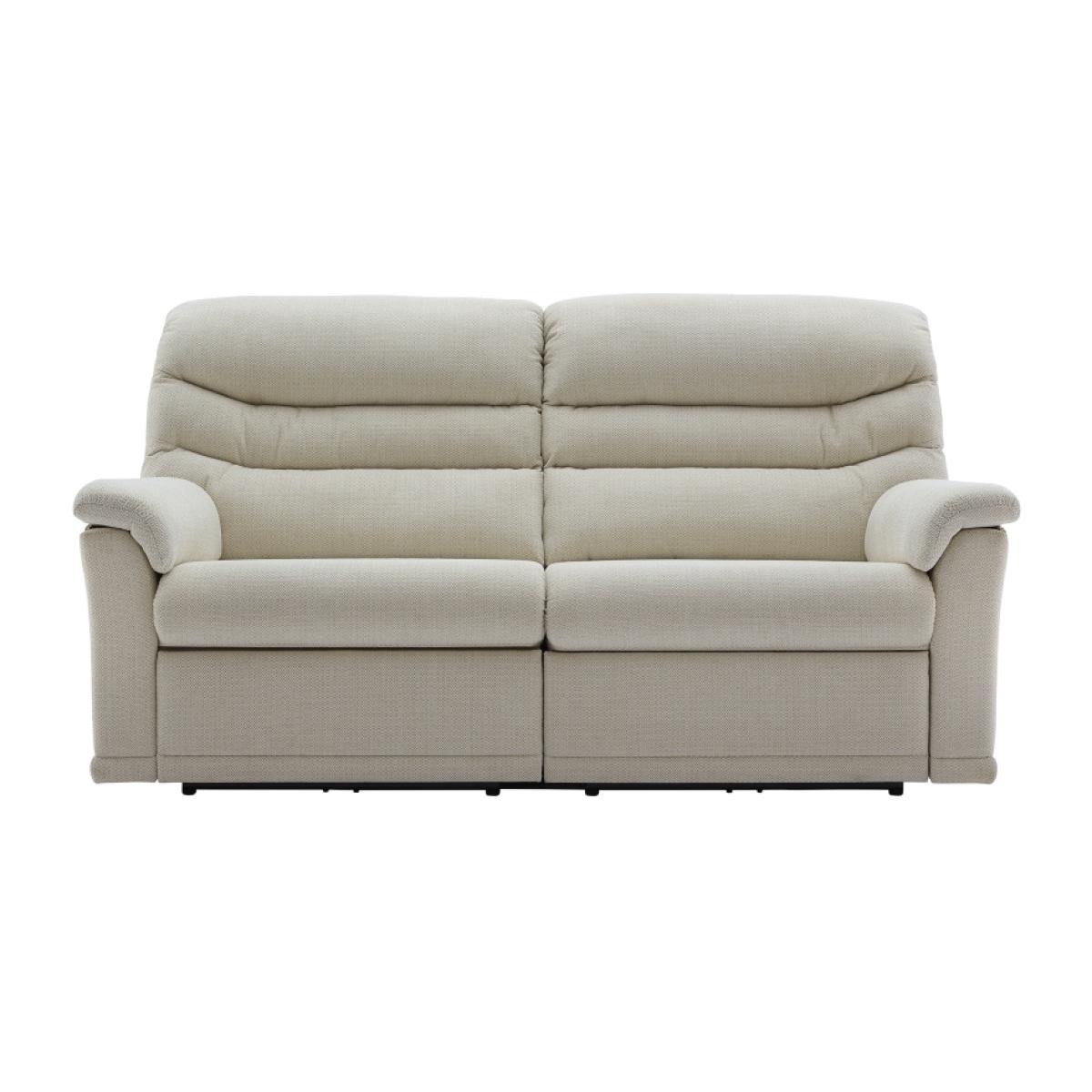 The G Plan Malvern 2 Cushion 3 Seater Recliner Sofa offers the ultimate in luxury and relaxation, combining classic design with modern comfort. This spacious sofa is perfect for family living, featuring two plush, generously padded cushions that provide superior support and comfort. The high backrest, soft armrests, and deep seats are designed to cradle you in comfort, while the smooth manual or power reclining mechanism allows each seat to effortlessly adjust to your preferred position for personalized relaxation. Upholstered in premium fabric or fine leather, the Malvern 3 Seater Recliner Sofa is available in a variety of colors to suit any decor. With its timeless appeal and meticulous craftsmanship, this sofa is the ideal centerpiece for your living room, offering a perfect blend of elegance, durability, and exceptional comfort for years to come. As always with G Plan, you can choose from a range of beautiful fabrics and leathers to suit your style. The G Plan Malvern 3 Seater Sofa is also available as a 3 cushion sofa. Pieces are handcrafted in the UK with a 25 year timber frame and frame construction guarantee. Features: Choice of manual or power recliners Malvern offers a classic, elegant style with signature G Plan comfort. Generous high backed and upright sit provides the ultimate support. Gentle curved details on the arm provides softness. Choose from a range of beautiful fabrics and leathers to suit your style. Options of 2 or 3 cushions on the 3 seater sofa design. Handy storage footstool option available. Handcrafted in the UK with a 25 year timber frame & frame construction guarantee. 3 Seater Sofa Dimensions: Height - 105.1 cm Width - 198.1 cm Depth - 97 cm Depth Reclined - 170cm Seat Height - 52cm Seat Width - 151cm Seat Depth: 51cm Please note: Recliner sofas are supplied in sections for ease of delivery. LHF = left hand facing action when viewed from front. RHF = right hand facing action when viewed from front. Recliner furniture requires room to recline. Scatter cushions are available at an additional cost. All measurements are approximate and relate to the overall size of the item including soft arm cushions where fitted and back cushions. All screens vary in colour reproduction and whilst every effort has been made to display the colour as accurately as possible it is for guidance only.