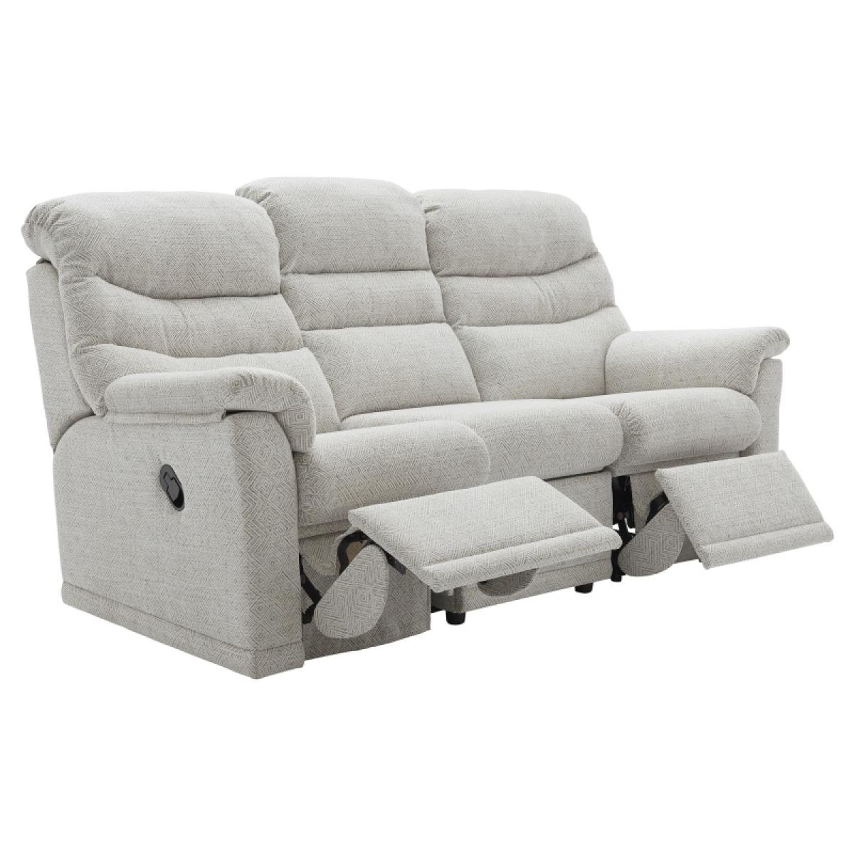 Experience the pinnacle of comfort and style with the G Plan Malvern 3 Cushion 3 Seater Recliner Sofa, a perfect blend of classic elegance and modern functionality. Designed with three plush, generously padded cushions, this spacious sofa provides ample seating and superior support for the entire family. Each seat is equipped with a smooth manual or power reclining mechanism, allowing you to effortlessly find your ideal position for relaxation. The high backrest, soft armrests, and deep seats ensure you’re cradled in comfort, whether you’re lounging or entertaining guests. Upholstered in premium fabric or luxurious leather, the Malvern 3 Seater is available in a range of colors to complement any decor. Crafted with meticulous attention to detail, this recliner sofa combines timeless design with enduring quality, making it a stylish and comfortable addition to your living space. As always with G Plan, you can choose from a range of beautiful fabrics and leathers to suit your style. The G Plan Malvern 3 Seater Sofa is also available as a 2 cushion sofa. Pieces are handcrafted in the UK with a 25 year timber frame and frame construction guarantee. Features: Choice of manual or power recliners Malvern offers a classic, elegant style with signature G Plan comfort. Generous high backed and upright sit provides the ultimate support. Gentle curved details on the arm provides softness. Choose from a range of beautiful fabrics and leathers to suit your style. Options of 2 or 3 cushions on the 3 seater sofa design. Handy storage footstool option available. Handcrafted in the UK with a 25 year timber frame & frame construction guarantee. 3 Seater Sofa Dimensions: Height - 105.1cm Width - 203.2cm Depth - 97cm Depth Reclined - 170cm Seat Height - 52cm Seat Width - 151cm Seat Depth: 51cm Please note: Recliner sofas are supplied in sections for ease of delivery. LHF = left hand facing action when viewed from front. RHF = right hand facing action when viewed from front. Recliner furniture requires room to recline. Scatter cushions are available at an additional cost. All measurements are approximate and relate to the overall size of the item including soft arm cushions where fitted and back cushions. All screens vary in colour reproduction and whilst every effort has been made to display the colour as accurately as possible it is for guidance only.
