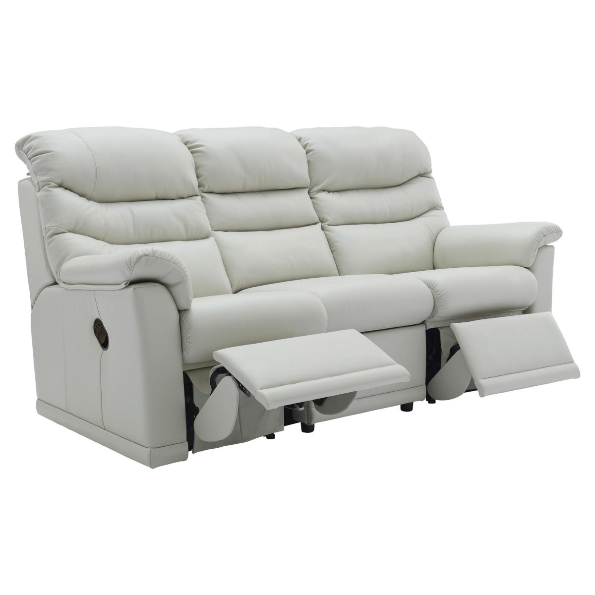 Experience the pinnacle of comfort and style with the G Plan Malvern 3 Cushion 3 Seater Recliner Sofa, a perfect blend of classic elegance and modern functionality. Designed with three plush, generously padded cushions, this spacious sofa provides ample seating and superior support for the entire family. Each seat is equipped with a smooth manual or power reclining mechanism, allowing you to effortlessly find your ideal position for relaxation. The high backrest, soft armrests, and deep seats ensure youre cradled in comfort, whether youre lounging or entertaining guests. Upholstered in premium fabric or luxurious leather, the Malvern 3 Seater is available in a range of colors to complement any decor. Crafted with meticulous attention to detail, this recliner sofa combines timeless design with enduring quality, making it a stylish and comfortable addition to your living space. As always with G Plan, you can choose from a range of beautiful fabrics and leathers to suit your style. The G Plan Malvern 3 Seater Sofa is also available as a 2 cushion sofa. Pieces are handcrafted in the UK with a 25 year timber frame and frame construction guarantee. Features:. *Choice of manual or power recliners *Malvern offers a classic, elegant style with signature G Plan comfort. *Generous high backed and upright sit provides the ultimate support. *Gentle curved details on the arm provides softness. *Choose from a range of beautiful fabrics and leathers to suit your style. *Options of 2 or 3 cushions on the 3 seater sofa design. *Handy storage footstool option available. *Handcrafted in the UK with a 25 year timber frame frame construction guarantee. 3 Seater Sofa Dimensions:. *Height - 105.1cm *Width - 203.2cm *Depth - 97cm *Depth Reclined - 170cm *Seat Height - 52cm *Seat Width - 151cm *Seat Depth: 51cm Please note:. Recliner sofas are supplied in sections for ease of delivery. LHF left hand facing action when viewed from front. RHF right hand facing action when viewed from front. Recliner furniture requires room to recline. Scatter cushions are available at an additional cost.. All measurements are approximate and relate to the overall size of the item including soft arm cushions where fitted and back cushions.. All screens vary in colour reproduction and whilst every effort has been made to display the colour as accurately as possible it is for guidance only..