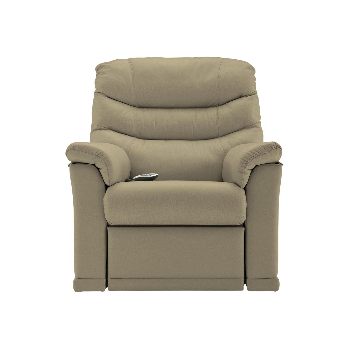 You really can have it all. The G Plan Malvern collection offers good looks and superior comfort. The high backs, luxurious cushioning and excellent lumbar support invite you to sit down and relax in style. There’s even a lift and rise chair. Handcrafted with pride in the UK.• Outstanding lumbar support • Upholstered in a high-quality leather • Reversible cold cure foam seat cushionFind your comfort zone with the G Plan Malvern Small Leather Rise and Recline Armchair. Sumptuously comfortable cold cure foam cushions and fibre filled back cushions deliver luxurious comfort time and again. Enjoy outstanding lumbar support with moulded cushioning and a high back design with a dual motor lift and rise action. Get to your feet safely and easily as the seat lifts up and effortlessly control the backrest and footrest individually for a perfect, fine-tuned position. High-quality leather upholstery only adds to the luxury quality and feel of this G Plan chair. Indulge in the best of British craftsmanship with this sumptuous design that promises exceptional comfort and effortless operation. Available in a fantastic selection of colours. The G Plan Malvern Small Leather Rise and Recline Armchair is part of the sumptuously comfortable Malvern collection. Natural leather has unique marks and characteristics with variance in colour and texture, and softens with use. Smoothing the cushioned top prevents ‘puddling’.