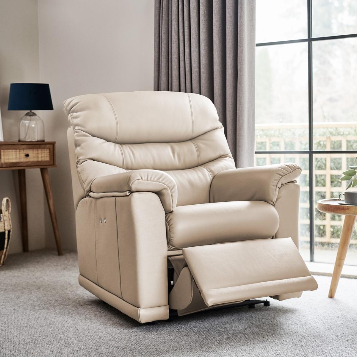 The Malvern Recliner Chair offers a classic, elegant style with signature G Plan comfort. Generous high backed and upright sit provides the ultimate support whilst gentle curved details on the arm provides softness. With manual or power recliner options available for the ultimate relaxation. As always with G Plan, you can choose from a range of beautiful fabrics and leathers to suit your style. Pieces are handcrafted in the UK with a 25 year timber frame and frame construction guarantee. Built with a robust frame and plush cushioning, this recliner features a smooth, reclining mechanism that effortlessly adjusts to your preferred angle, allowing you to relax fully. Whether you're unwinding with a book, watching TV, or taking a nap, this recliner chair is the perfect addition to your living room or den, combining comfort, functionality, and timeless design. Features: Manual or power recliner options available for the ultimate relaxation Malvern offers a classic, elegant style with signature G Plan comfort. Generous high backed and upright sit provides the ultimate support. Gentle curved details on the arm provides softness. Choose from a range of beautiful fabrics and leathers to suit your style. Handcrafted in the UK with a 25 year timber frame & frame construction guarantee. Recliner Chair Dimensions: Height - 106.4cm Width - 94cm Depth - 96.5cm Depth when reclined - 170cm Seat Height - 51cm Seat Width - 45cm Seat Depth - 51cm Arm Height - 66cm Please note: Recliner furniture requires room to recline. Scatter cushions are available at an additional cost. All measurements are approximate and relate to the overall size of the item including soft arm cushions where fitted and back cushions. All screens vary in colour reproduction and whilst every effort has been made to display the colour as accurately as possible it is for guidance only.
