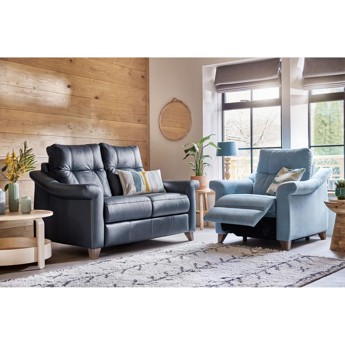 The Riley embodies sophistication with full, sumptuous seats, which provides unquestionable comfort. Stylish flared arm and back detailing provide contemporary design. Choose from a range of beautiful fabrics and leathers to suit your style. Show wood legs available in a choice of four finishes, Walnut, Mahogany, Oak, and Ebony. Manual or power recliner options are available for the ultimate relaxation and all power recliner options come with touch buttons and a USB charging port as standard. Small Sofa Dimensions Height:104cm Width:159cm Depth:97cm Seat Height: 53cm Seat Depth: 55cm Seat Width: 115cm Clearance needed for full recline: 70cm Recliner sofas are supplied in sections for ease of delivery. Handcrafted in the UK with a 25-year timber frame and frame construction guarantee. All measurements are approximate and relate to the overall size of the item including soft arm cushions where fitted and back cushions. All furniture supplied on show wood legs as standard. Recliners are available in manual or power versions. The power versions have touch buttons and a USB charging port. Contrast stitch available on selected leathers. Large and small double recliner sofas are delivered in two sections that link together. Seat cushions and back cushions are non-reversible. Our recliner furniture requires room to recline. Scatter cushions are available at extra cost. All screens vary in colour reproduction and whilst every effort has been made to display the colour as accurately as possible it is for guidance only