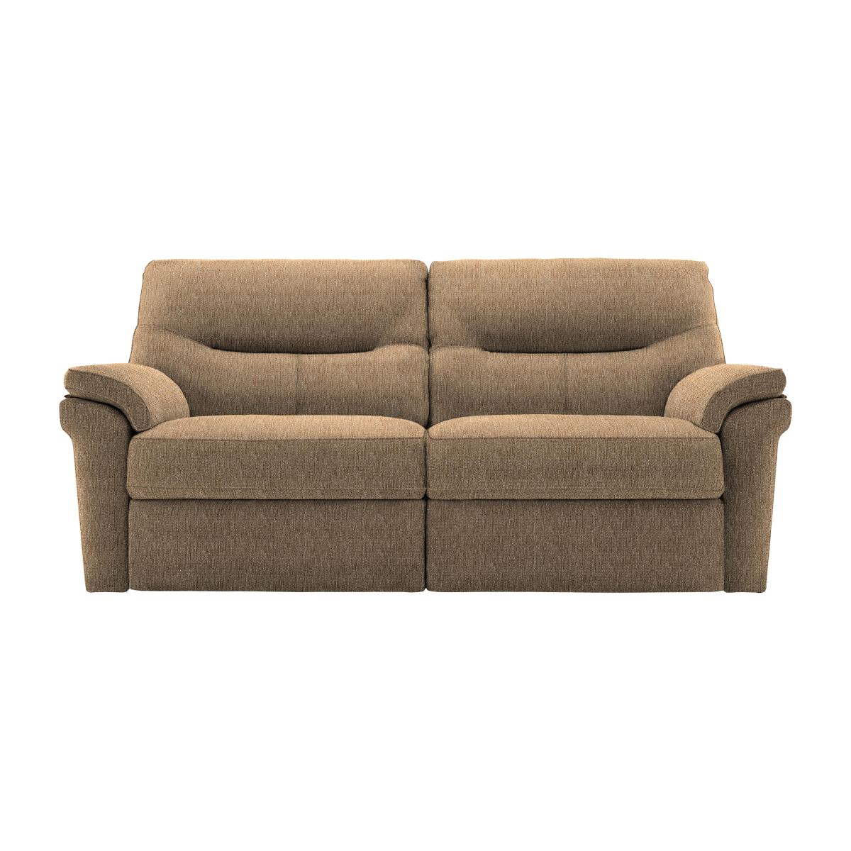 The Seattle range brings you the very best of G Plan – thoughtful design, understated contemporary style and world-famous craftsmanship – alongside some superb comfort features including effortlessly smooth power recliners, innovative power lumbar support and even integrated USB ports. Every sofa and armchair in the range makes relaxing easier thanks to the deep, supportive sprung seats, and the sumptuous cushioning achieves the perfect balance of softness and support. This carefully curated range is available in your choice of premium 100% leather and high-quality fabric, both of which are offered in an exceptional range of classic and contemporary colours. Beautifully handcrafted in the UK.Sit back and really, really relax. Along with power recliners, this G Plan Seattle 3-seater fabric sofa has power lumbar support that definitely hits the spot. Why you'll love it This 3-seater fabric power recliner sofa takes you to a new level of comfort and support. Relaxed contemporary style with unique comfort features. Innovative power lumbar delivers exceptional support, when and where you need it. Find your perfect relaxed position with smooth power recliners. Enjoy a deep and supportive sit thanks to the sprung base, soft curves and superb cushioning. Integrated USB ports for easy device charging. So many beautiful upholstery fabric styles and colours to choose from. 25-year frame guarantee. Beautifully handcrafted in the UK. This 3-seater fabric power recliner sofa with power lumbar is part of the G Plan Seattle range. What you need to know Medium comfort level. Seat suspension: springs. Seat cushions are fixed. Back cushioning: premium-quality fibre. Back cushions are fixed. This sofa is supplied on glides. Please allow time for new recliners to ease. Minor gaps are necessary to ensure ease of recliner motion and may be exaggerated depending on floor type. Some fabrics can show wear on areas of more use or in direct sunlight. Clean regularly using a soft brush or vacuum with the curtain attachment. Deal with any spills promptly. Professional cleaning advised for oil- and grease-based stains. Please read our upholstery care guide for more advice.