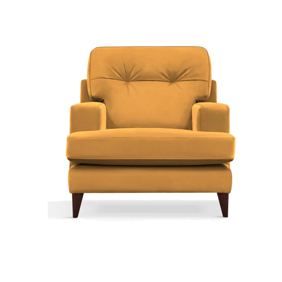 I’m a fan of the Seventy Two armchair for its clean, mid-century silhouette and the way the dark legs ground the mustard upholstery. The foam-wrapped seat and back offer firm support, making it both comfortable and durable. This chair works well in Scandinavian, retro or contemporary living rooms. Position it beside a slim wooden side table with a tactile knit throw draped over one arm to introduce texture. Pair with a minimalist floor lamp and a neutral rug so the mustard hue really pops, or tuck it into a reading nook alongside leafy plants to soften its angles.