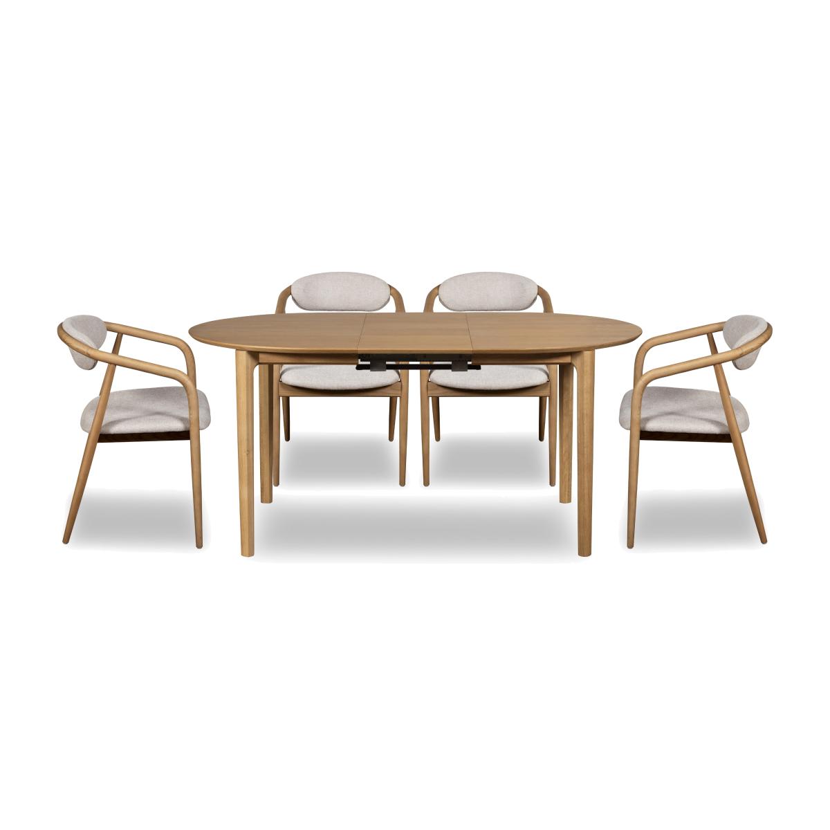 If you’re drawn to mid-century style, you’ll delight in the dining room furniture of the G Plan Winchester range. With a light oak finish, characteristically smooth curves, understated details and an emphasis on the natural beauty of wood, the collection is everything we love about G Plan – the master crafter of mid-century style – paired with authentic retro design. Comprising a well-rounded collection of dining sets, storage furniture and occasional tables, the range also offers two different extending dining table shapes, traditional rectangular and sociable round, which converts to a pleasing oval shape when you’re entertaining guests. The G Plan Winchester look is also available as bedroom furniture. Beautifully smooth curves, a fashionable pale oak finish and a wealth of well-crafted details? The G Plan Winchester oval dining set is a mid-century-inspired original that’s made for modern homes. Why you'll love it On-trend mid-century style with a paler oak finish from G Plan. This extending dining table is a fabulous choice for modern, minimal and Scandi interiors. With understated details that highlight the beautiful oak veneer woodgrain. Smooth butterfly extension mechanism – the extra leaf is stored within the table when not in use. Seats 6 when extended. With a set of 4 of the range’s dining arm chairs. Chairs have striking curves and slender tapered legs. The comfortably cushioned seats and backrests are upholstered in a grey fabric. This dining set is part of the G Plan Winchester range. What you need to know Chairs are made with oak and ash wood. Dining table is made with oak veneer and rubberwood. 130 cm dining table seats 4 and extends to 170 cm to seat 6. Oak and oak veneer surfaces will show variation in colour. Knots, filled knots and other markings are to be expected. Avoid placing in direct sunlight or close to a heat source. We recommend using placemats and coasters at all times. Love the look? Be sure to browse the G Plan Winchester bedroom furniture range. Item code: WINCDSET7-001