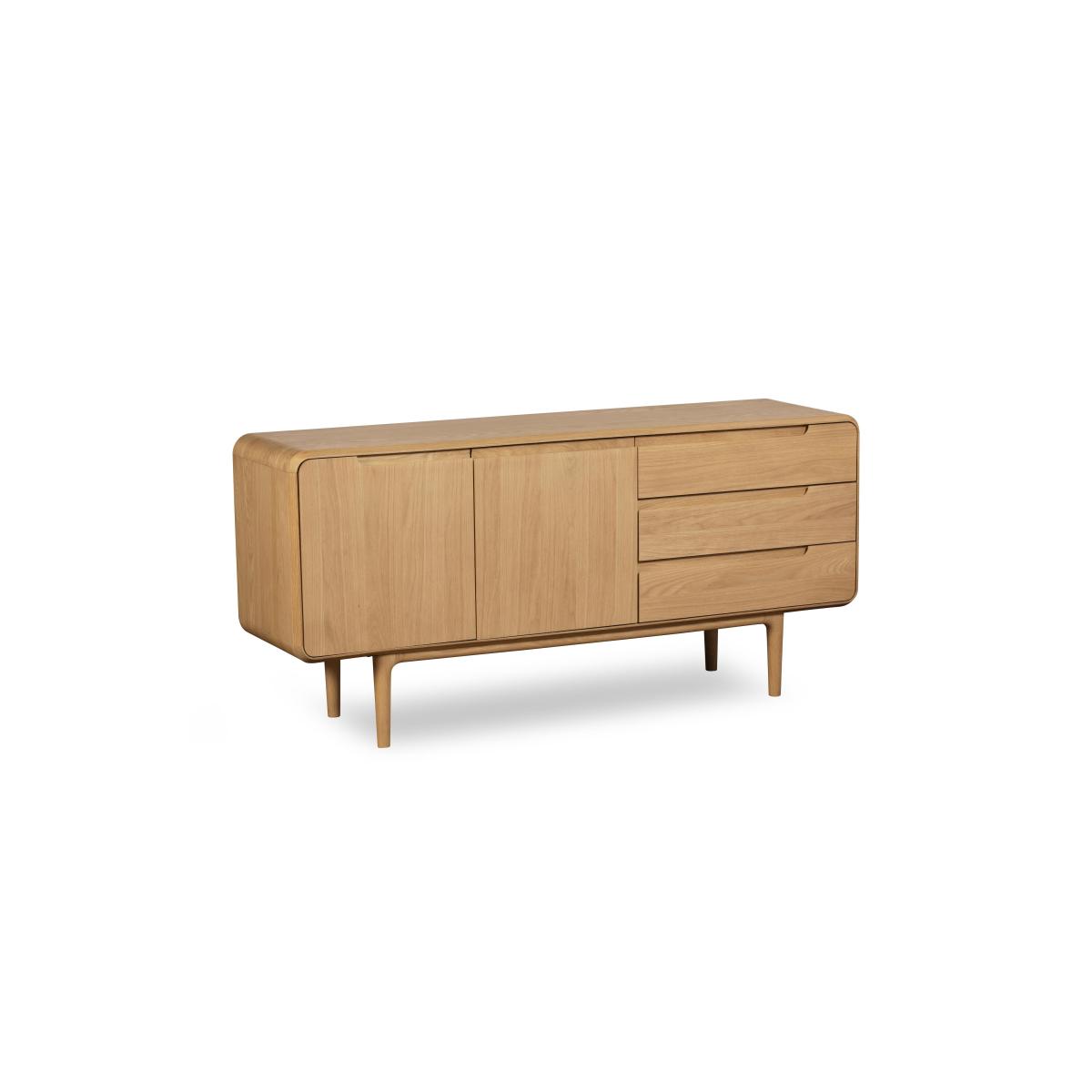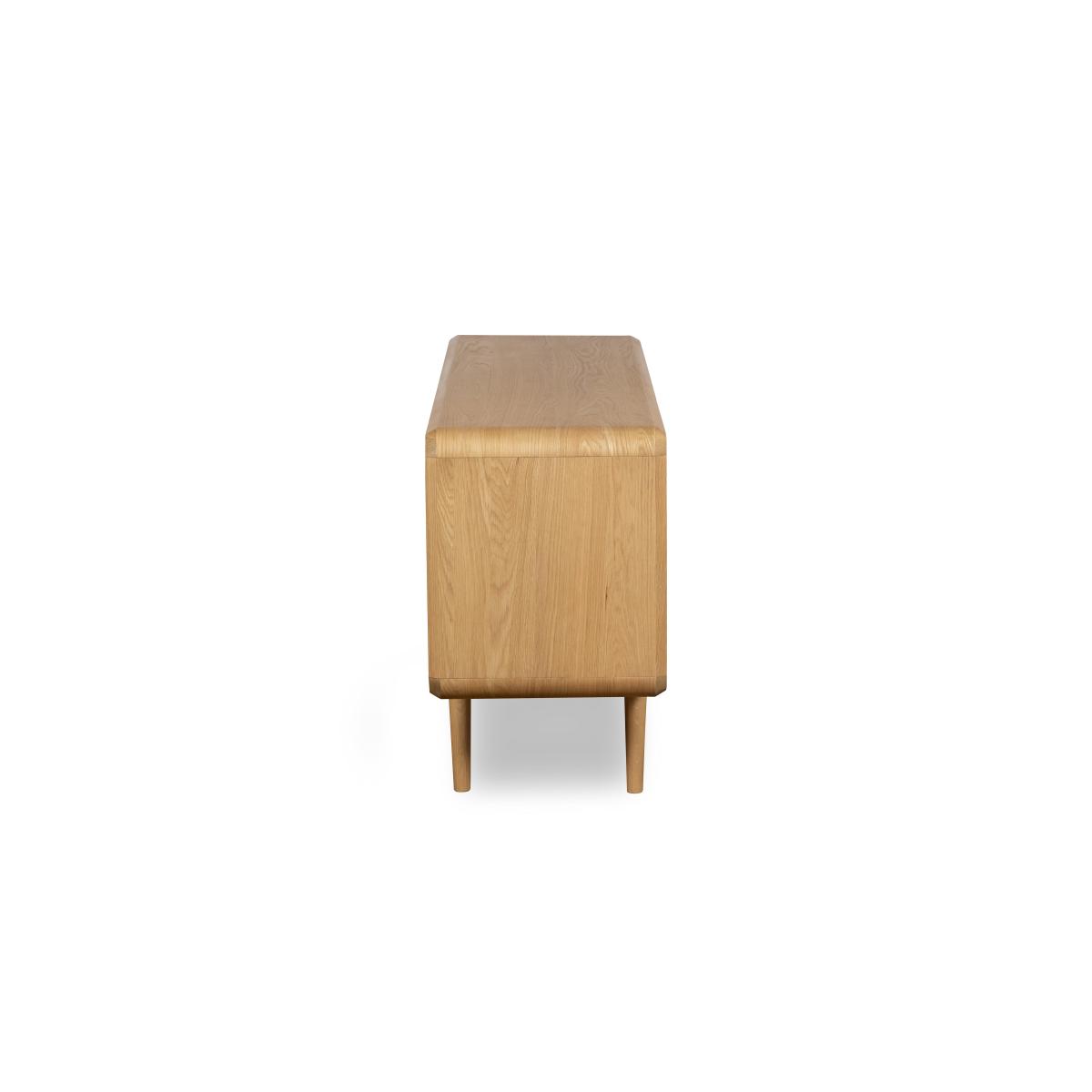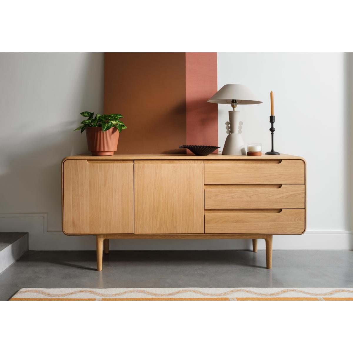 If you’re drawn to mid-century style, you’ll delight in the dining room furniture of the G Plan Winchester range. With a light oak finish, characteristically smooth curves, understated details and an emphasis on the natural beauty of wood, the collection is everything we love about G Plan – the master crafter of mid-century style – paired with authentic retro design. Comprising a well-rounded collection of dining sets, storage furniture and occasional tables, the range also offers two different extending dining table shapes, traditional rectangular and sociable round, which converts to a pleasing oval shape when you’re entertaining guests. The G Plan Winchester look is also available as bedroom furniture. Beautifully smooth curves, a fashionable pale oak finish and a wealth of well-crafted details? The G Plan Winchester wide sideboard is a mid-century-inspired original that’s made for modern homes. Why you'll love it On-trend mid-century style with a stylish paler oak finish from G Plan. This wide sideboard is a fabulous choice for modern, minimal and Scandi interiors. Smooth curved silhouette. With understated details that highlight the beautiful oak veneer woodgrain. Elongated integrated handles. Large cupboard and 3 drawers provide spacious storage. This wide sideboard is part of the G Plan Winchester range. What you need to know Double door cupboard has 1 fixed shelf. Made with oak veneer and rubberwood. Oak and oak veneer surfaces will show variation in colour. Knots, filled knots and other markings are to be expected. Avoid placing in direct sunlight or close to a heat source. We recommend using placemats and coasters at all times. Love the look? Be sure to browse the G Plan Winchester bedroom furniture range. WARNING! Item code: WINCSBD-LO-001