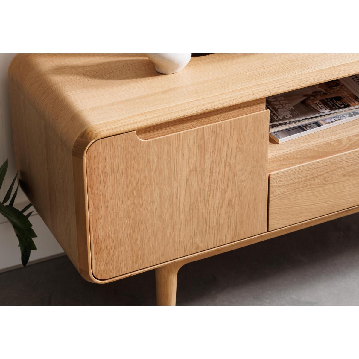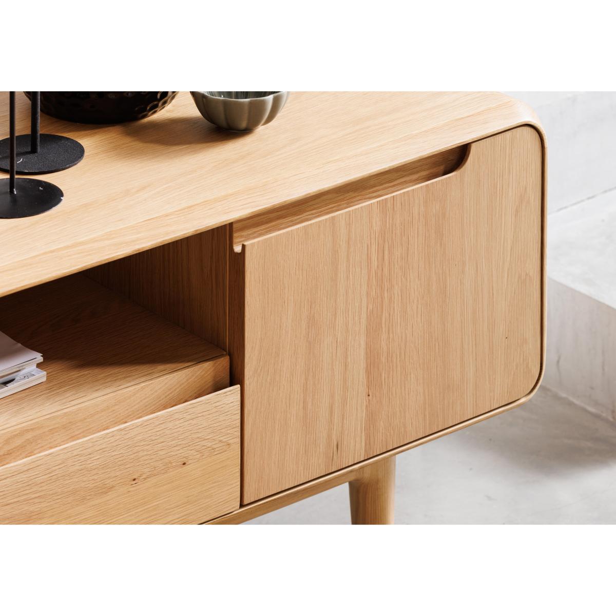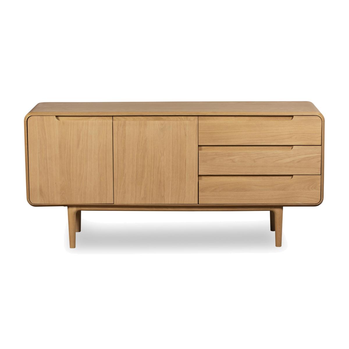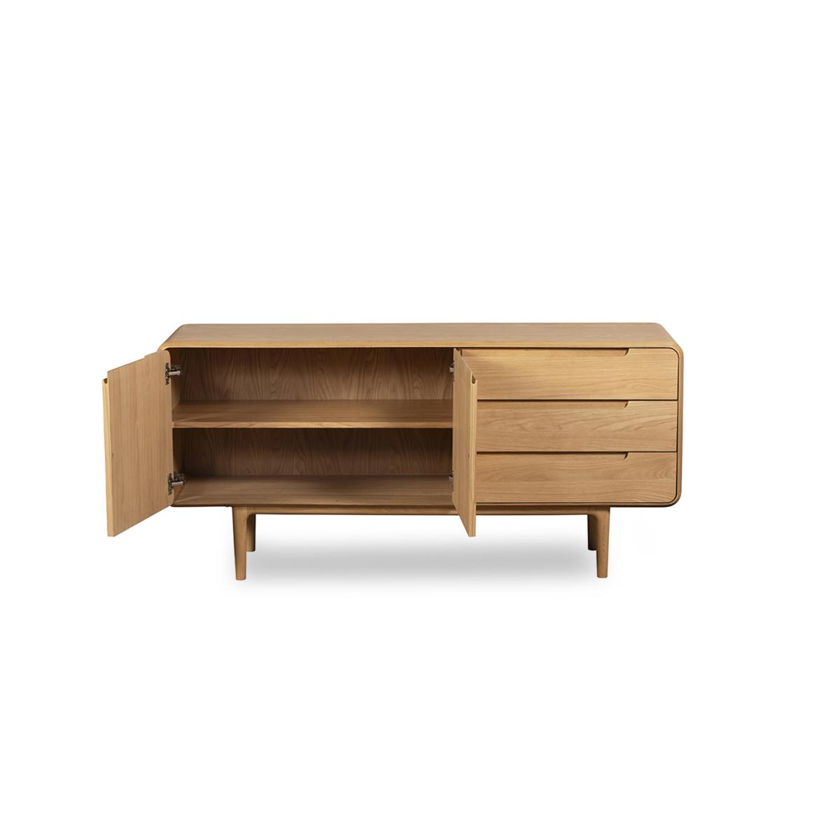 If you’re drawn to mid-century style, you’ll delight in the dining room furniture of the G Plan Winchester range. With a light oak finish, characteristically smooth curves, understated details and an emphasis on the natural beauty of wood, the collection is everything we love about G Plan – the master crafter of mid-century style – paired with authentic retro design. Comprising a well-rounded collection of dining sets, storage furniture and occasional tables, the range also offers two different extending dining table shapes, traditional rectangular and sociable round, which converts to a pleasing oval shape when you’re entertaining guests. The G Plan Winchester look is also available as bedroom furniture. Beautifully smooth curves, a fashionable pale oak finish and a wealth of well-crafted details? The G Plan Winchester wide sideboard is a mid-century-inspired original that’s made for modern homes. Why you'll love it On-trend mid-century style with a stylish paler oak finish from G Plan. This wide sideboard is a fabulous choice for modern, minimal and Scandi interiors. Smooth curved silhouette. With understated details that highlight the beautiful oak veneer woodgrain. Elongated integrated handles. Large cupboard and 3 drawers provide spacious storage. This wide sideboard is part of the G Plan Winchester range. What you need to know Double door cupboard has 1 fixed shelf. Made with oak veneer and rubberwood. Oak and oak veneer surfaces will show variation in colour. Knots, filled knots and other markings are to be expected. Avoid placing in direct sunlight or close to a heat source. We recommend using placemats and coasters at all times. Love the look? Be sure to browse the G Plan Winchester bedroom furniture range. WARNING! Item code: WINCSBD-LO-001