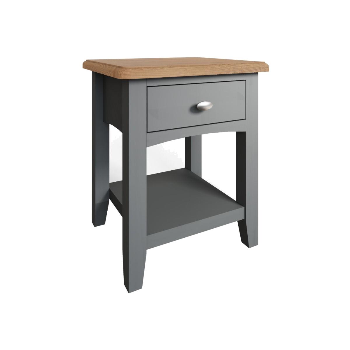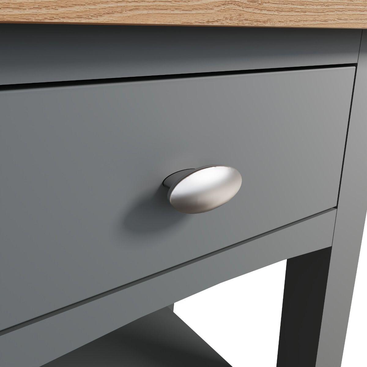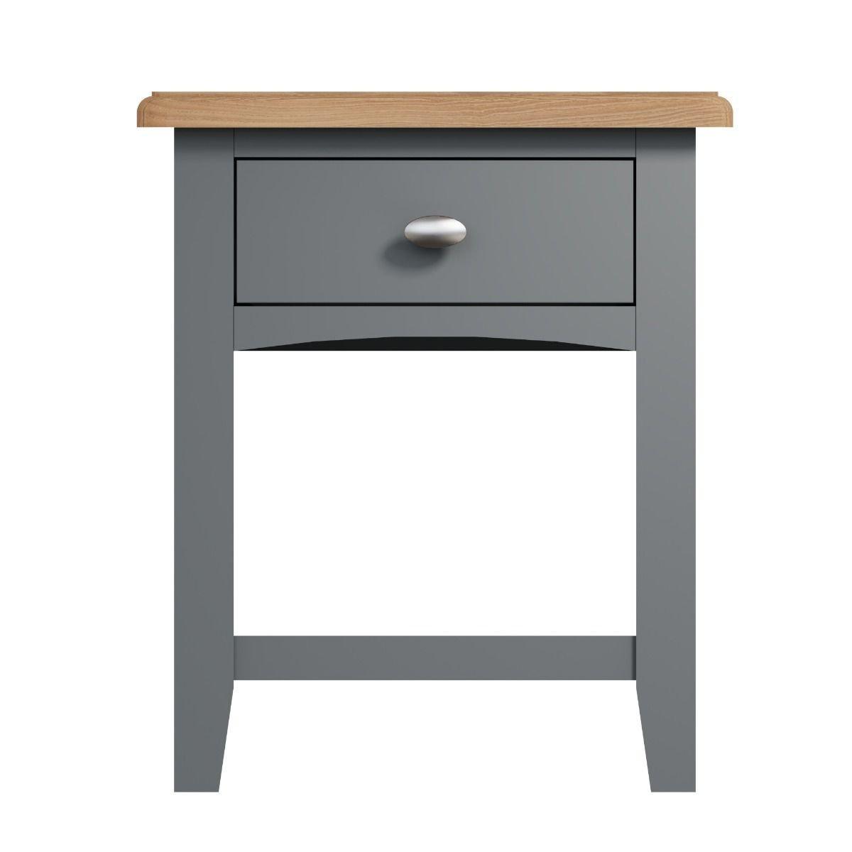 Rustic lamp table with drawers and a dark grey finish. Add a rustic touch to your bedroom, hallway and lounge with the dark grey lamp table. Featuring a modern light oak top, brushed oblong metal knob and drawer space. Perfect for use as a bedside table beside the bed or as a lamp table in lounges and hallways.